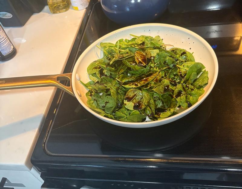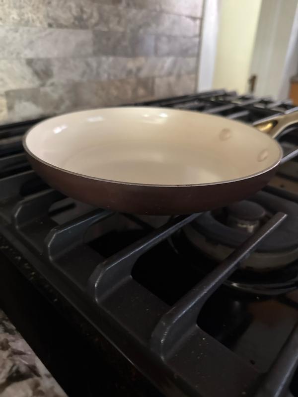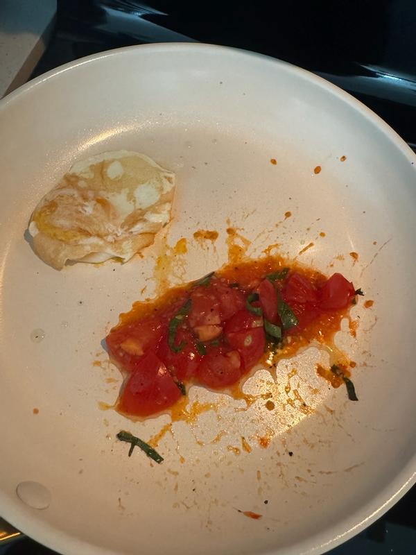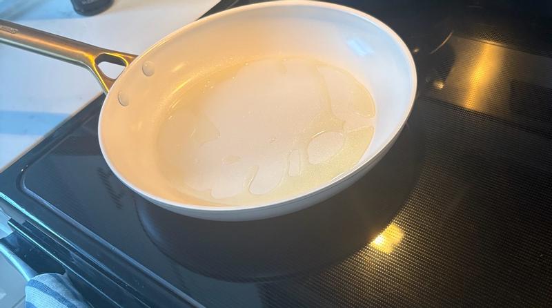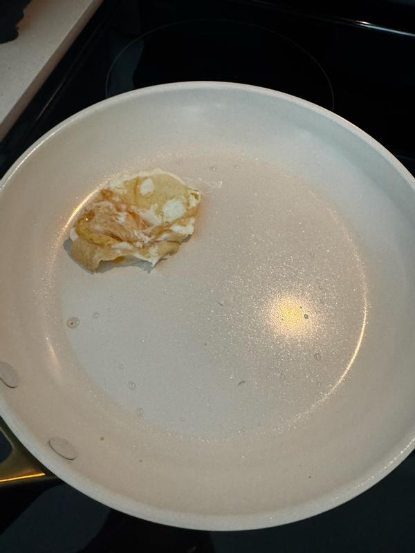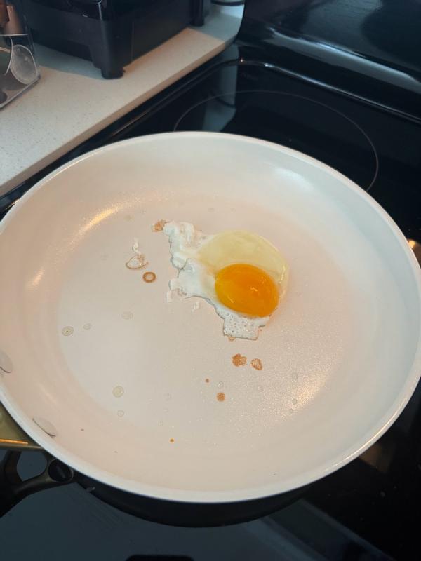 I used this to cook breakfast today and was really impressed! I followed the directions and preheated the pan to medium and used olive oil. The egg was easy to flip in the pan and everything heated evenly ! I even wiped the pan clean after using which is SO NICE for cleanup. I love the beautiful esthetic these pans provide with the white surface and blue beneath. The gold handle is beautiful. I love the fact that these have no PFOAs or harmful chemicals in them. I love them!