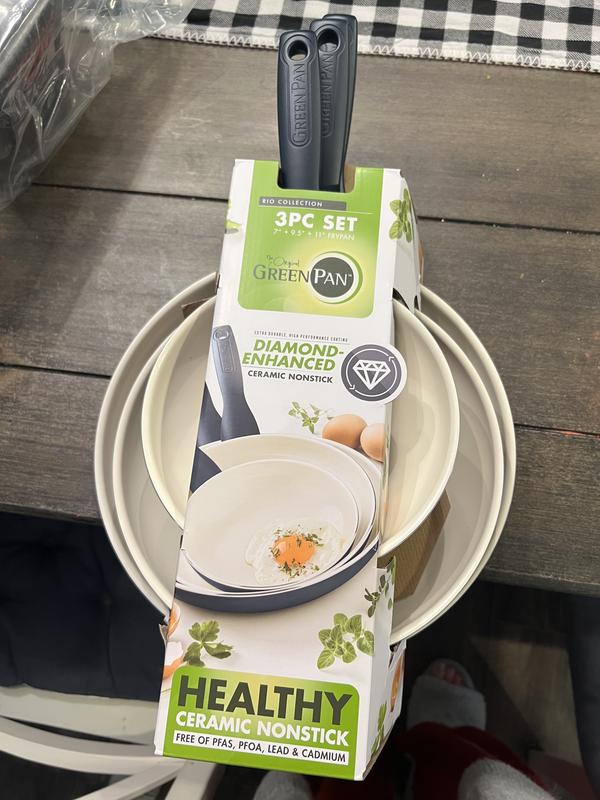 this is my first GreenPan order and I have to say I am really impressed with all the items I have purchased so far. the 3 piece frypan set has performed very well, eggs, bacon, grilled cheese sandwiches, all were cooked to perfection and the cleanup was a breeze