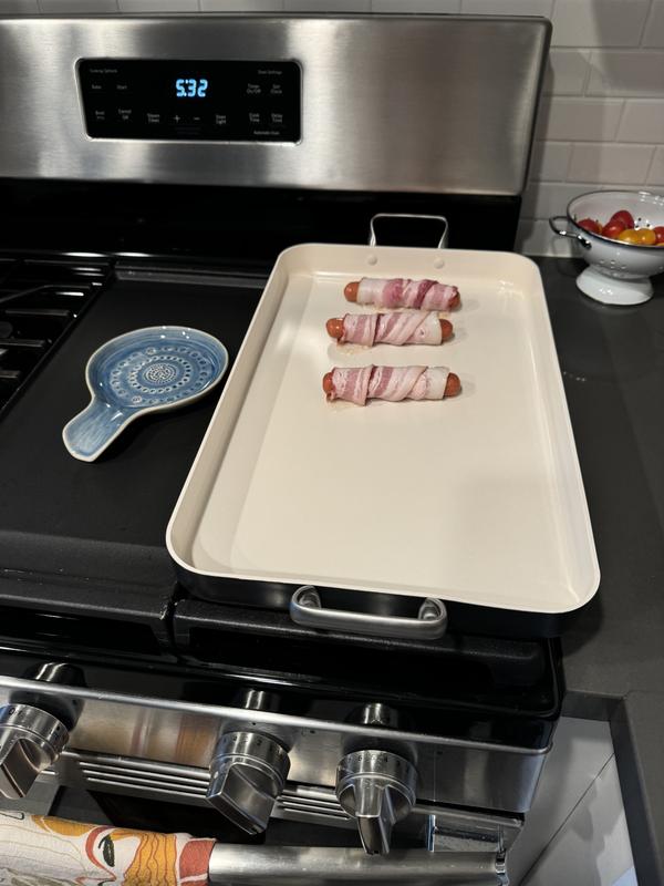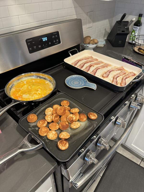 Had a Wolf Range with built in griddle for years and got used to having a super hot flat iron surface! When I moved new stove had 6 burners but no griddle. Figured for once or twice a month pancakes it wouldn't be a big deal. It was a big deal. I bought this to see if spanning two burners would work. It takes a bit of moving it around but this pan is solid without being heavy and is large enough for 6 large pancakes if thats your jam on Sunday mornings. Also great for grilled cheese and burgers when the kids are here. I really like this brand of an and the cream non stick surface!