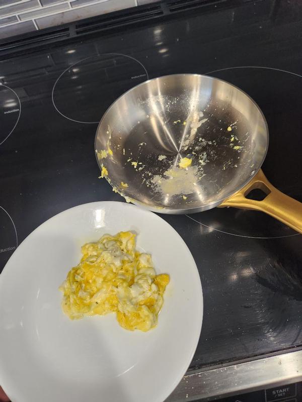 This is a nice stainless steel pan, it cooked my eggs perfectly and clean up was a breeze. You do have to heat the pan before cooking anything in it, otherwise it might stick. But if you properly heat it, it will cook everything beautifully and not stick to the pan. Excited to sear some meat in the pan and be able to bake it in the oven to finish! Love the multi use aspect of this pan.