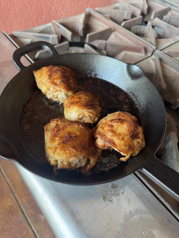 Solid cast iron. Easy to clean. Made chicken thighs got a good sear and put in oven