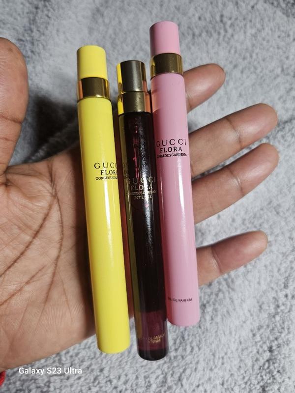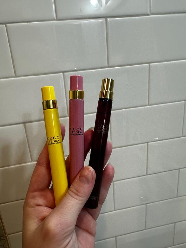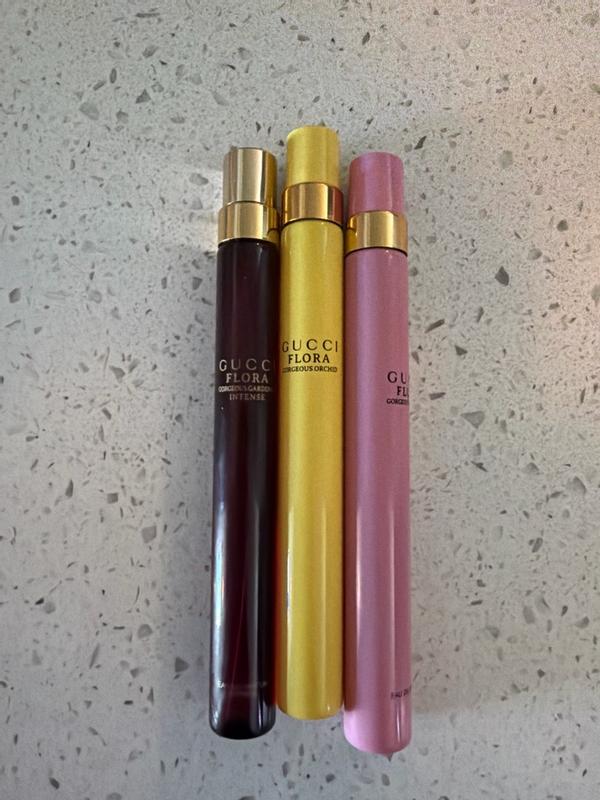 I loved gucci flora, the three of them smells amazing, my favorite is the gorgeous orchid, I been wanting to try this perfume and didn't disappoint, the intense smells so good, and the fixation It's great on my clothes; even after washing them, you can still smell the fragrance. It also lasts a long time on my skin, all day long. I'm delighted with these perfumes; they're perfect for traveling and convenient to carry in my bag.