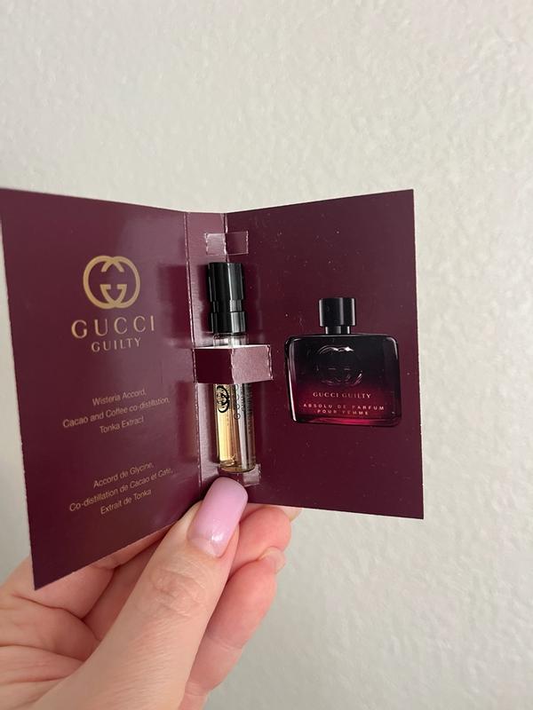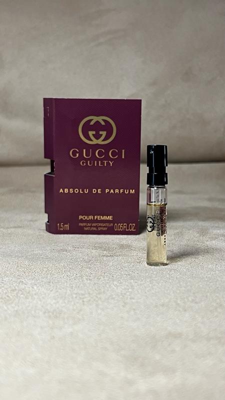 Gucci Guilty Absolu de Parfum is a fragrance with character — not about lightness, but about confidence and femininity. You can clearly feel notes of coffee, amaretto, and warm tonka beans, which make it smell cozy and luxurious. After application, there’s a gentle sweetness, but not too sugary — it smoothly transitions into a soft, slightly woody trail. The scent lasts for hours on skin and clothes. It’s more of an evening perfume — perfect for autumn or winter, for dates or special occasions. Overall, it’s a rich, deep fragrance for those who love warm, noticeable scents. Regular sample packaging.