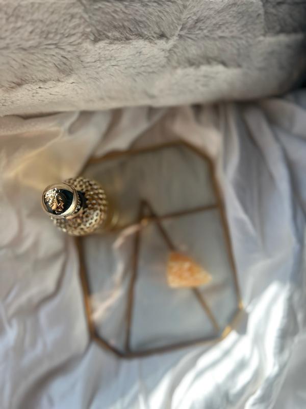 This fragrance is really like a 3.5 stars, it’s a tough one to rate. On the one hand I really am into the bright refreshing citrus smell. At first I was confused with the gorgeous honey comb appearance of the bottle but then I noticed some warmer notes of a sweeter hint of vanilla. The fragrance was nice but just overall too strong all together and just too much. I only sprayed one spritz on my wrist, it just sat a bit heavy, I wished I could have had half. As for the physical bottle- I am in love! It’s a gorgeous piece to leave on a makeup vanity, bathroom counter or desk. The gold hexagon is really beautifully designed. One funny thing I kept thinking the whole gold top would pop off to use but you only flick open the top ball part so it sort of kept flying off when I went to open/smell it.