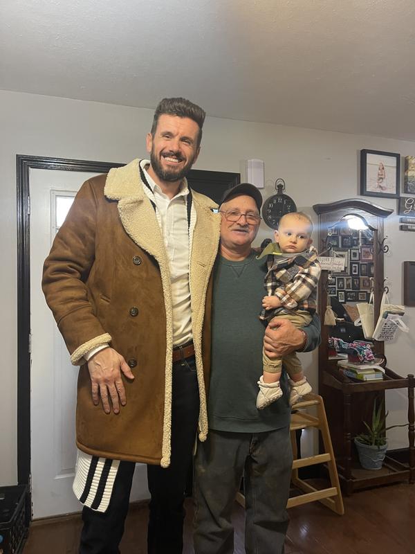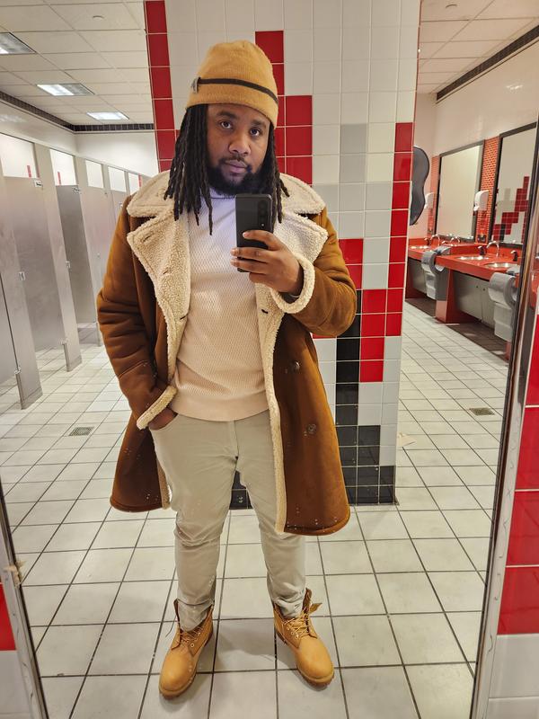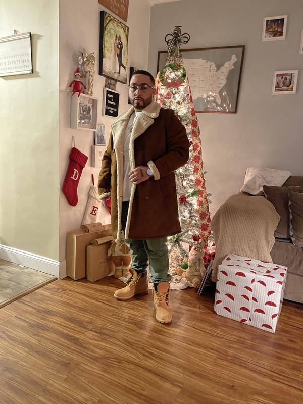 Great fit. Didn't know Macy's had the best leather goods at incredibly amazing deals. This overcoat is a rust tone and heavy. Outdoor coat for sure, in the coldest weather at 4am. cold mornings walking the dogs, it's perfect. Won't even feel the briskest winds. Inside, is a heavy whool type construction for the coldest nights. The arms are great, buy a size up to for your sweaters underneath. Covers the neck and it's quality build is really nice. Guess really did great with the faux shearling feeling so soft. Reaches the mid calves for 6' ft men. Love the quality leathers on big namebrands . Got shipped and to my door within a week. Macy's is my quality namebrands go to !