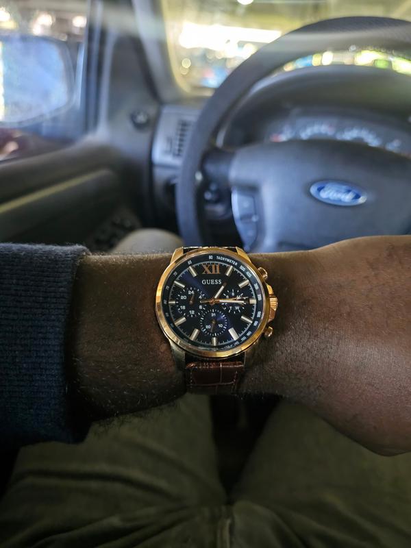 Sure to be a staple in your watch wardrobe, this clean dress looks features a chrono-look multi-function dial and is paired with a Croco leather strap.