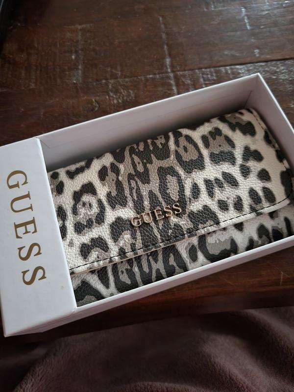 This slim clutch by GUESS offers multiple compartments to keep you organized and is accented with a leopard print for a bold finish.