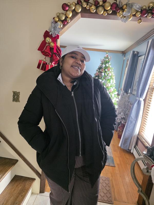 I really wanted to love this jacket, but there was too much going on with the design. The off-centered exterior zipper made for a unique look. However, the jacket couldn't be left unzipped because inside was a vest-like section with center zipper. So leaving the jacket unzipped looked bulky. Being entirely zipped up, outside and inside, made the jacket feel too confining and warm. The hood was large and floppy with no strings to tighten it. So in bad or windy weather, it probably wouldn't stay up. This could be a brilliant design without the interior zipped vest and with a hood that was more functional.