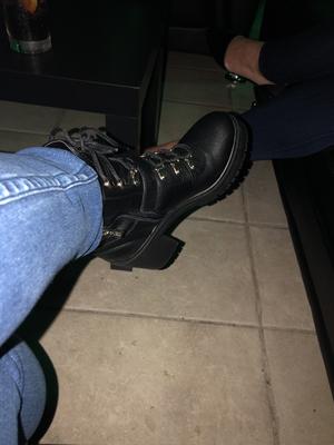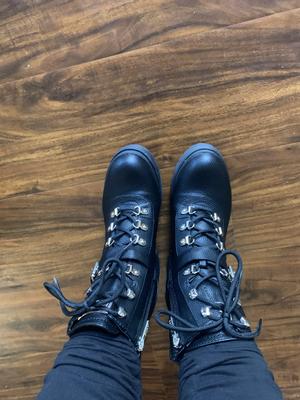Love the shoe. I bought it in black. Very comfortable and not heavy for a combat chunky boot. I wear a 9.5 but it fit like a 10. Very big. Exchange for a 9 and it feels good. Be sure to size down for comforting fit.