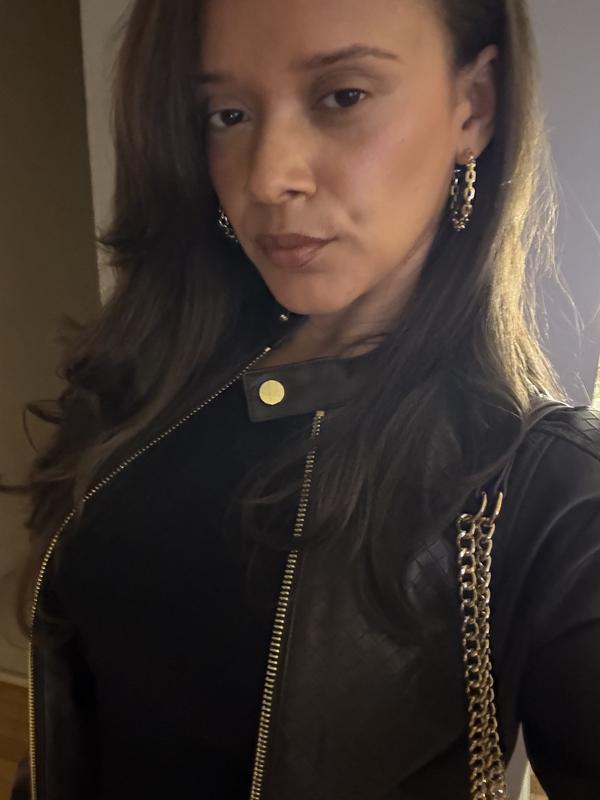 I love this faux leather jacket. Its stylish and looks and feel of great quality.