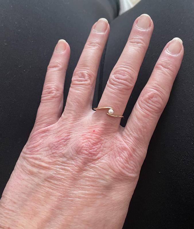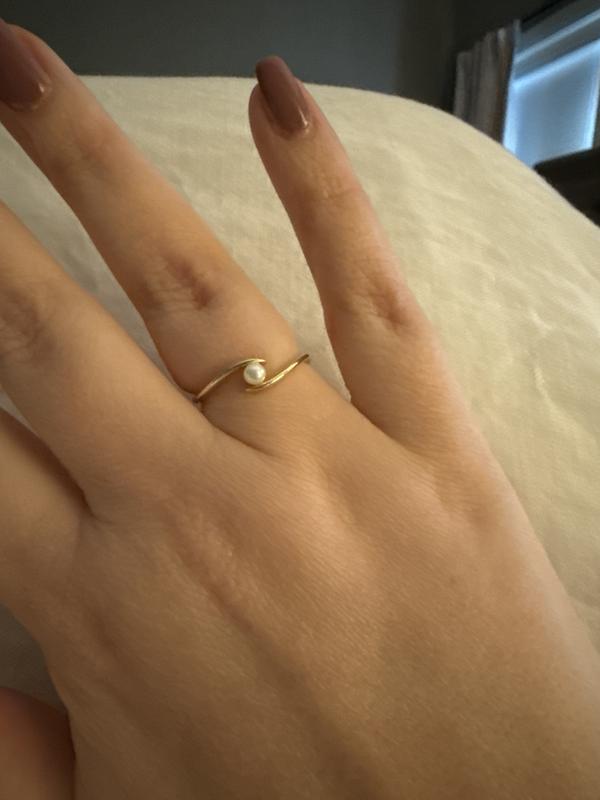 The ring is very delicate and thin. The pearl is small. The photo makes it look larger. I was a little surprised, but it is still a nice ring. It could get lost easily with other jewelry.