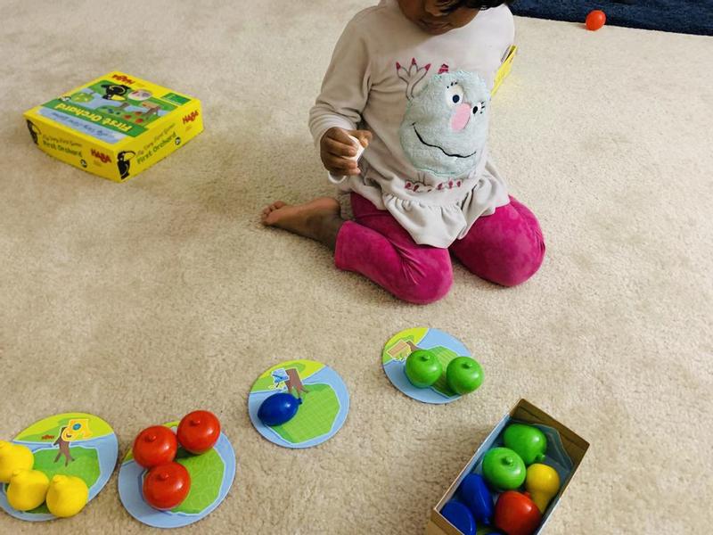 Our two year old grasped the rules after a single game. She now pulls it off the shelf at least once a day to play. The colorful fruit is just the right size for little hands and she even enjoys feeding it to the crow when we “lose” the game.