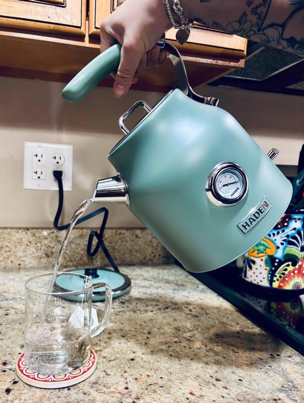 I’ve been using electric kettles for years, and this is by far my favorite! The old-school thermometer on the front is great. It allows you to see the temp and stop it there for herbal teas. It also lets you know if the water is still hot enough when you return for a second cup. The pouring handle doesn’t allow my knuckles to be burned. And I can’t say enough about how beautifully retro stylish it looks. I opted for the black and copper model. It also holds a ton of water and heats super fast. Love it!