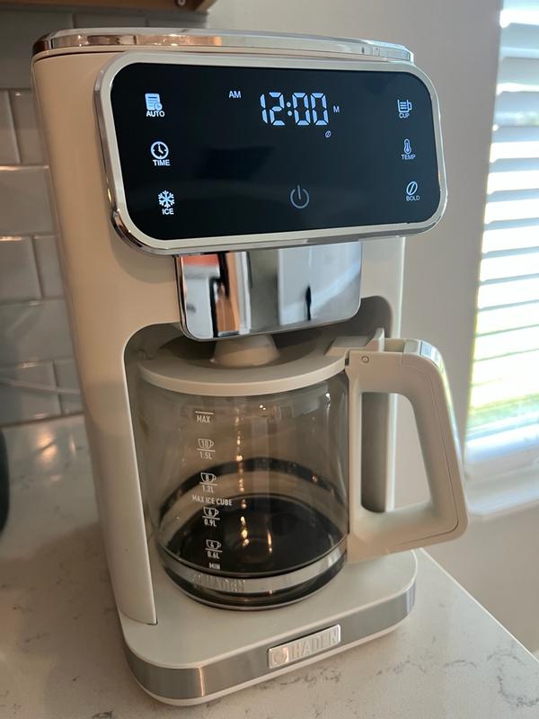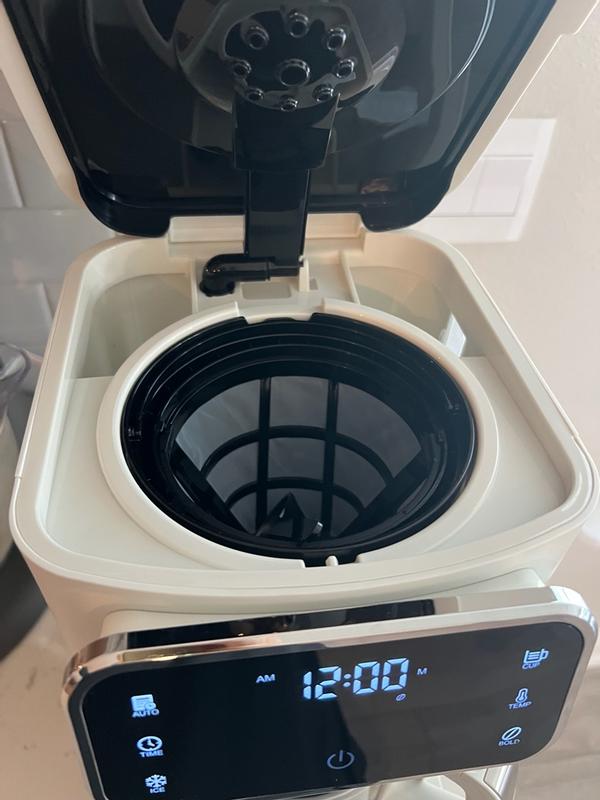 Looks beautiful on the counter with its ivory and chrome design. Makes both hot and iced coffee easily and tastes great every time. The programmable timer is handy for busy mornings. A little learning curve with the controls, but overall a great coffee maker.