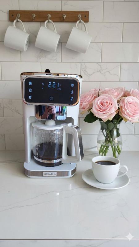 Haden Dual Brew 12-cup digital drip coffee maker that can brew hot or iced coffee. It has a digital display and touch control functions. Features include a programmable timer, keep warm function, adjustable brew strength settings, and an anti-drip feature It comes with a reusable filter, eliminating the need to purchase paper filters It has a 12-cup capacity and an automatic shut-off feature after 120 minutes. The design is retro-style and is available in several colors, including the cream/chrome model shown.