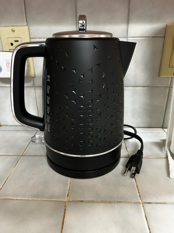 Comforting and interesting light weight design. Black model will definitely add style to a modern kitchen. Boils 3 cups of water in 3 minutes or less for quick and easy prep of tea, ramen and instant mashed potatoes(great for middle school and high-school kids diy after school meal prep). Auto shut off feature is nice when you are multitasking. Base could be heavier to ease in setting and removing the kettle.