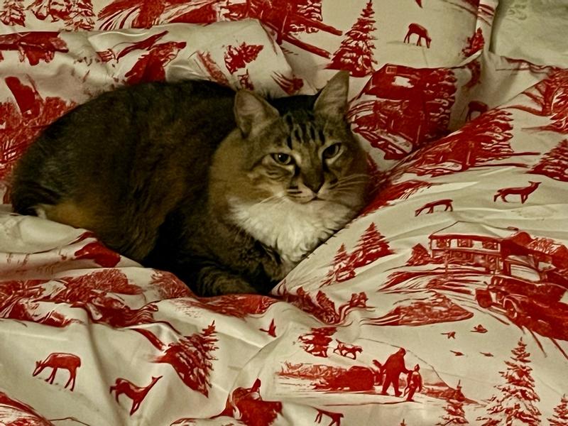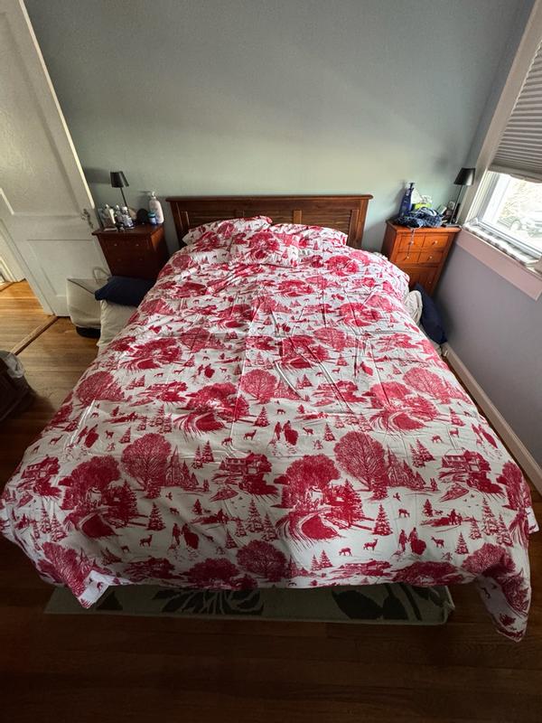 This is so darn cute and cheery! With its red and white design of Christmas trees and sleds, you can’t get more festive for the season! My husband even commented on how nice it looked when he walked into the bedroom (btw, his grandparents had a Christmas tree farm!) We’ve been using a down duvet for years and I wasn’t sure how we’d like the feel of more traditional comforter. Answer? We love it! The fabric is soft, fluffy, and cozy to sleep under. The cats love it too! Hopefully it will hold up over time and become part of our December traditions.