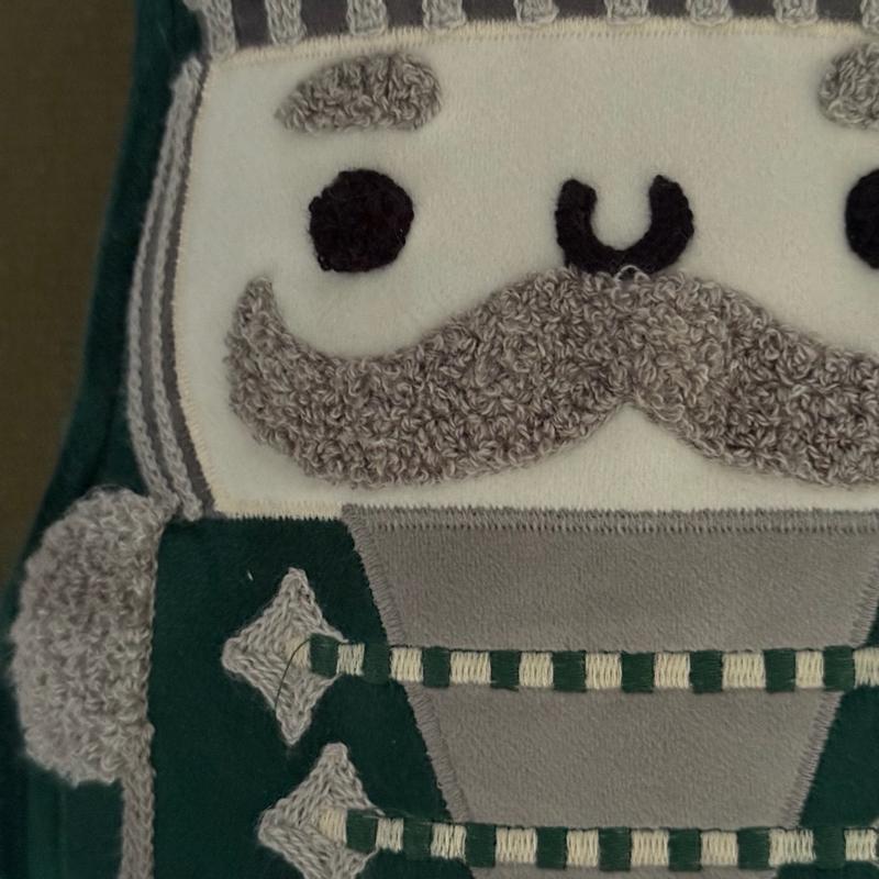 My favorite color is green so I was thrilled to have this emerald green Nutcracker. It's paired with a lovely shade of gray and the green parts pop against the neutral contrast . It's plush,so details show in 3D instead of a flat print. The seams and stitching look very well done and durable. Easy care and washable if necessary. It'll be part of our holiday decor for a long time.