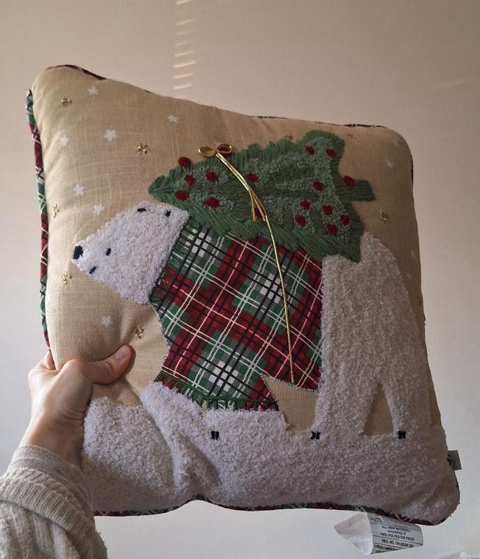 This pillow is so adorable, as you can see it’s a bear carrying a Christmas tree. Such a beautiful add on to my bed for the holidays. You can pair it with any color because it’s just beige. This was done very well, it will last me years.