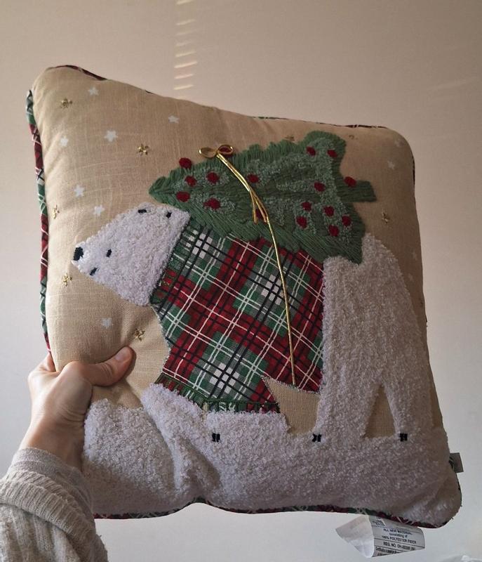 Thats the prettiest holiday decorative pillow, no doubt about that! Hallmark has very cute products, and it is just so pretty, I liked the design with the bear and the tree. Also it is good quality, and you can tell that it is well made and durable, it is 100% cotton shell, and it can be gently cleaned. It is a firm decorative pillow, It is a standard size 18×18in, and made in India. Not dissapointed.