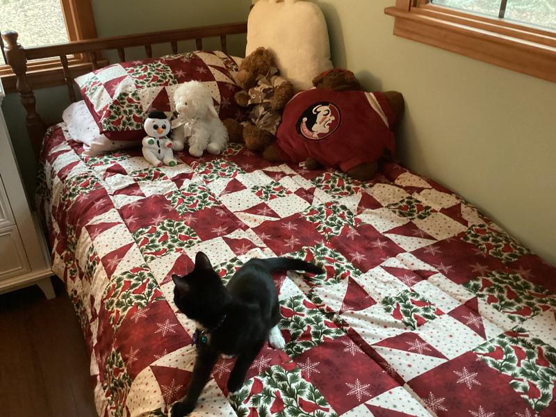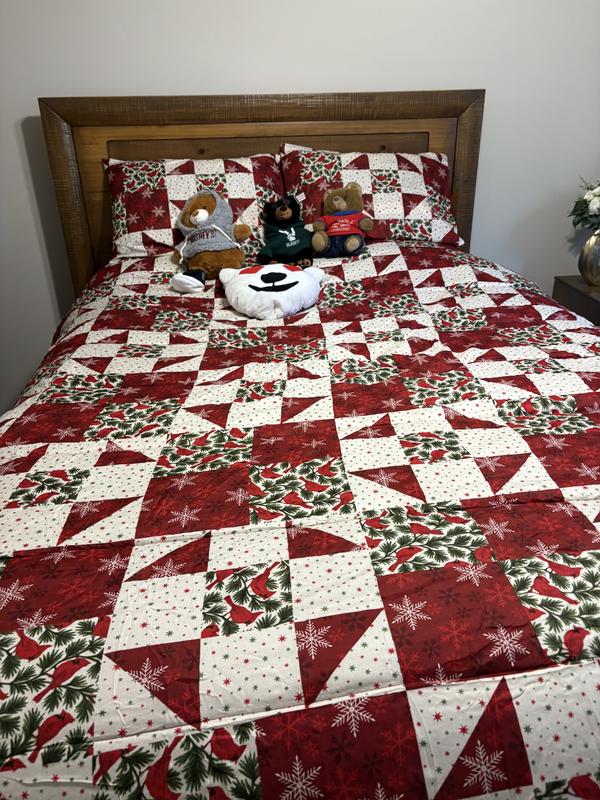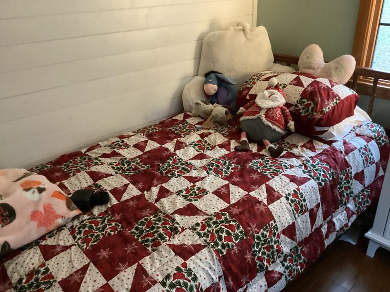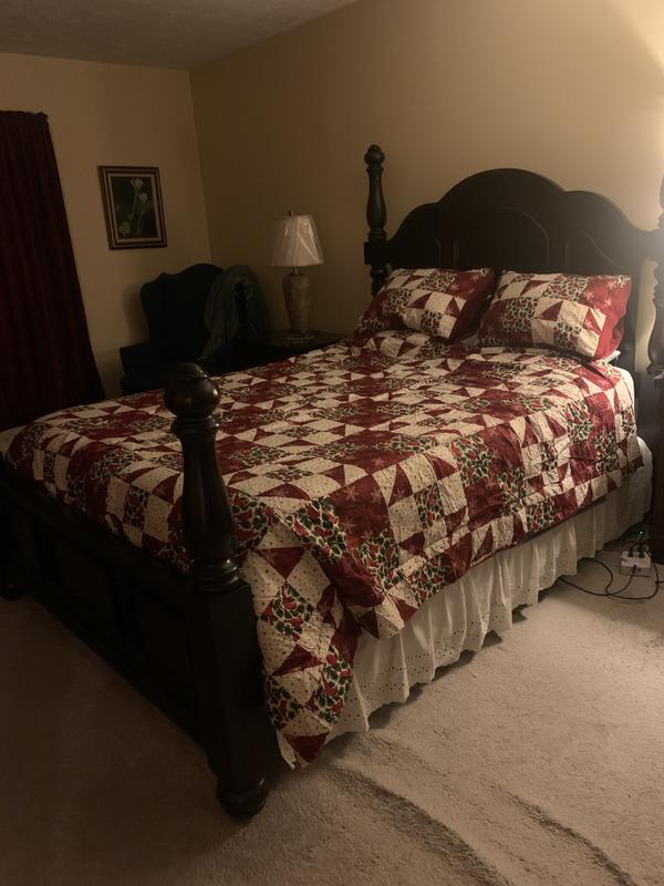 looks just beautiful, I have a split King bed and this comforter hangs evenly and long on both sides