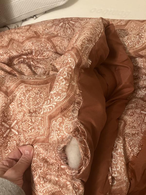 This is a beautiful two sided lightweight comforter with an eye catching medallion pattern design on one side and solid color on the reverse. The pink color is beautiful mixed with the medallion and floral pattern. The shams are lightweight and feel more like pillowcases.
