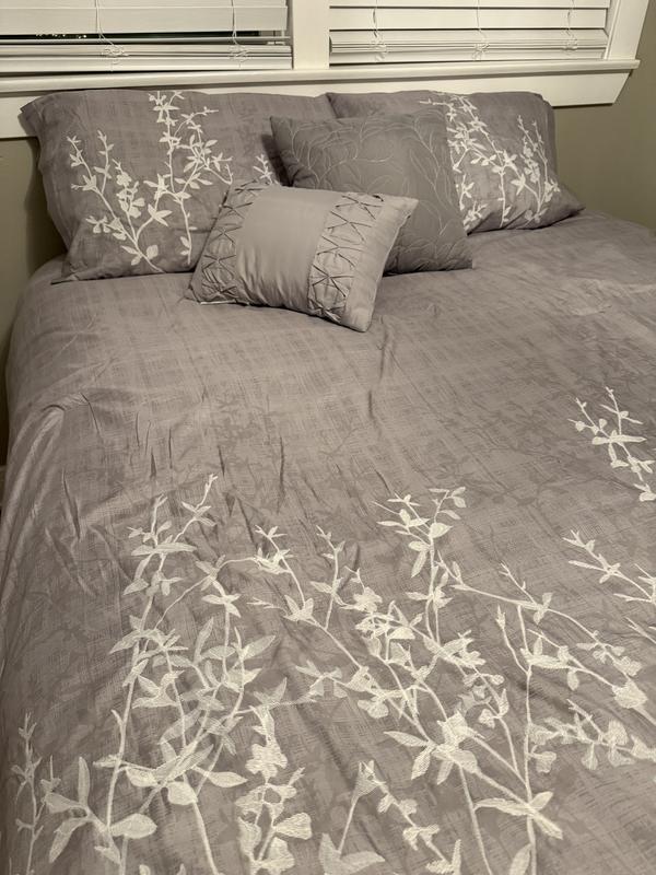 I received the Henly 5 pc Full/Queen Comforter set and I was very impressed with the embroidered design of leaves across the bottom of the comforter. The 2 shams and the comforter are very soft to the touch and very comfortable to my skin. The 2 pillows that were included added a personal touch to my bedroom. I really like using this set as it feels so nice when sleeping.