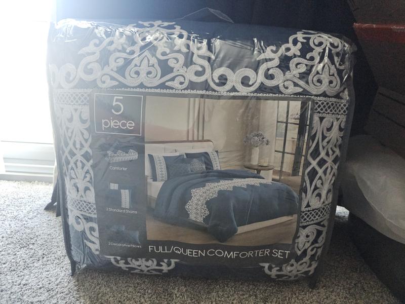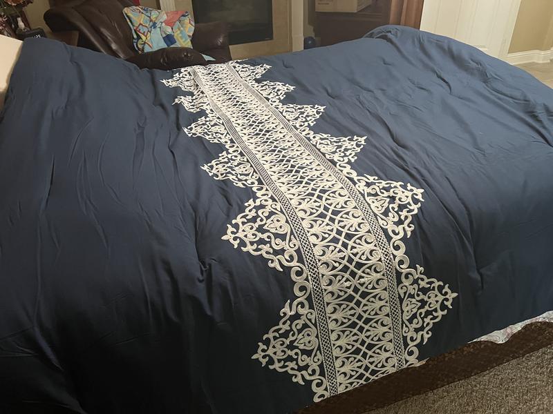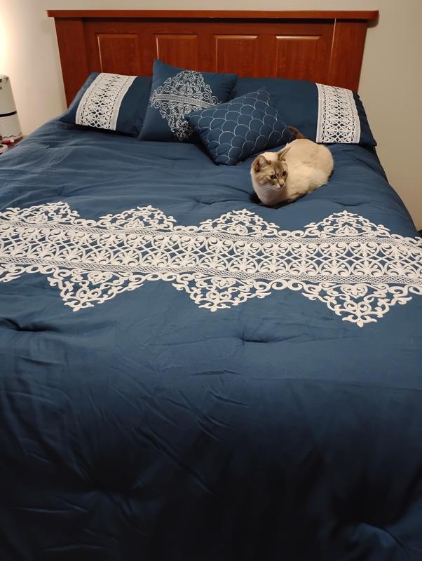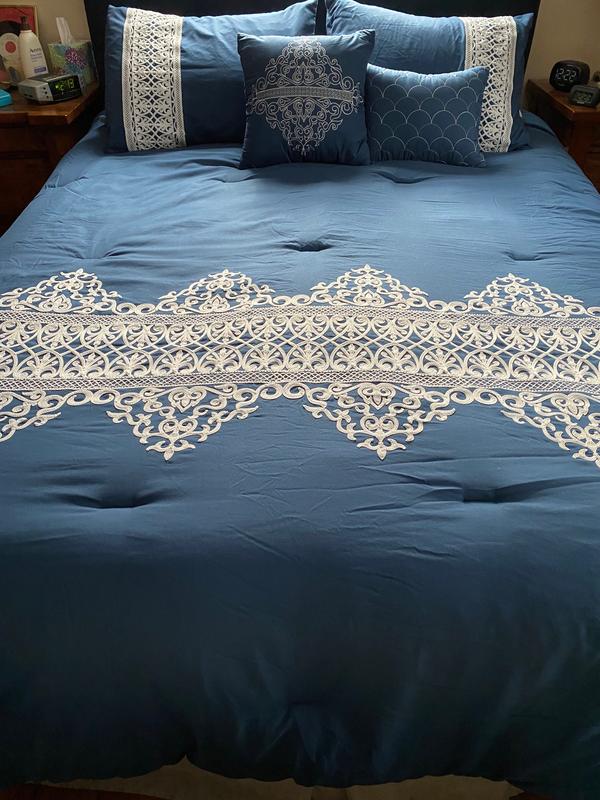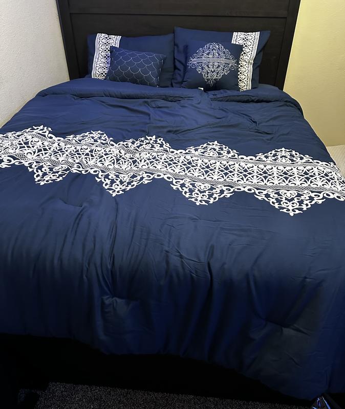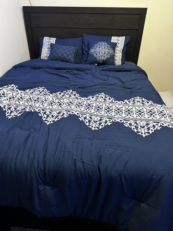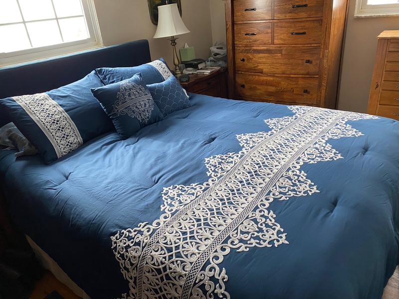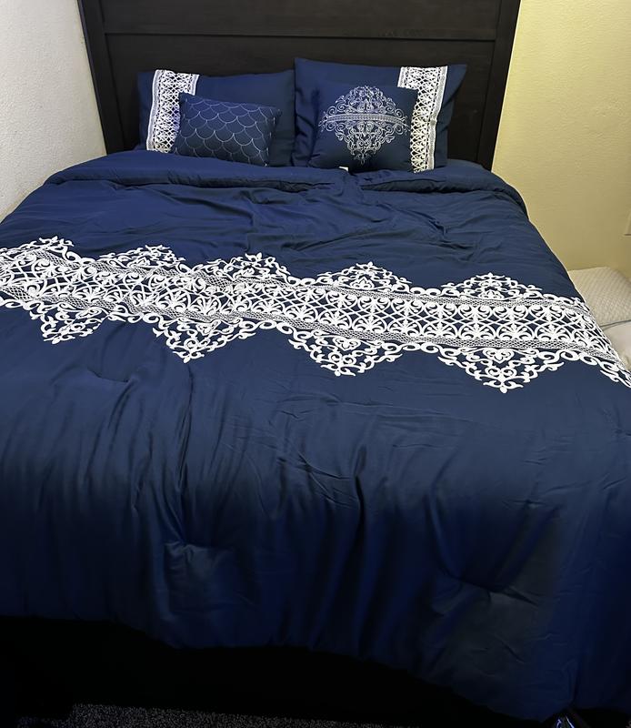 This navy comforter integrates perfectly into my master bedroom where the existing colors are bold yellows and blues. It is plush and offers plenty of warmth for those cold winter nights. The shams are tasteful and match the white lace design corresponding to the lace-like accent on the comforter itself. I absolutely love the accent pillows. Two are included with one sporting a similar lace-like design to the shams and comforter while the second pillow has a simple shell design that adds a different complimentary flair. The material is soft against your skin and makes sound sleeping easy.