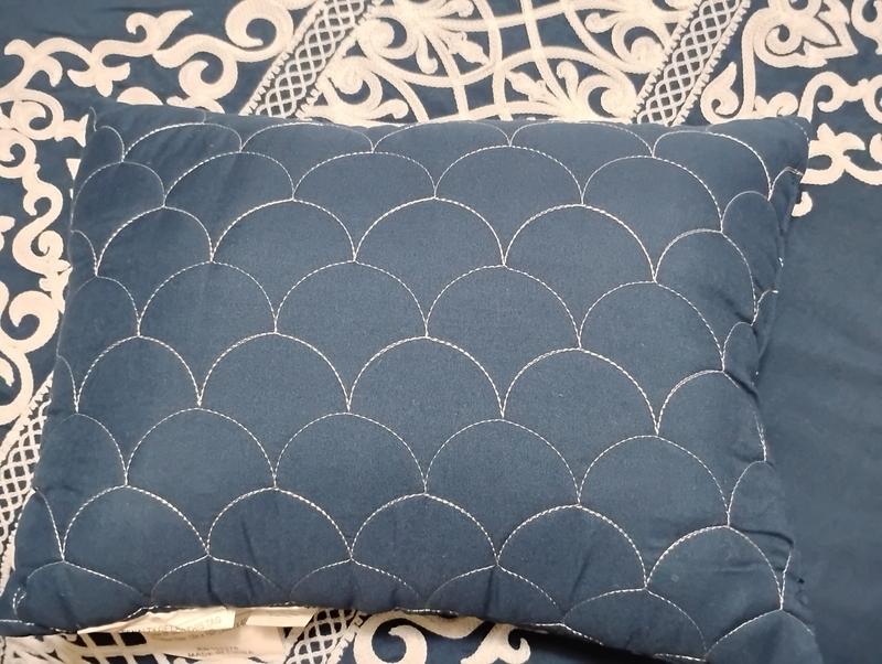 This comforter is very soft. The full/queen size fits my queen bed well and covers the sides. The shams are thin material but look very nice once they are on a pillow. The decorative pillows are cute and a nice size. The navy color is a deep blue and matches my navy headboard perfectly.