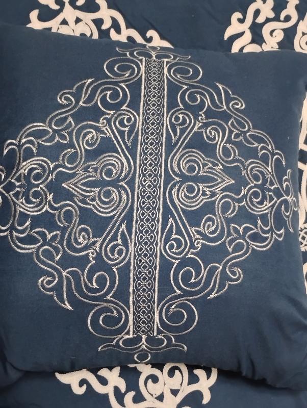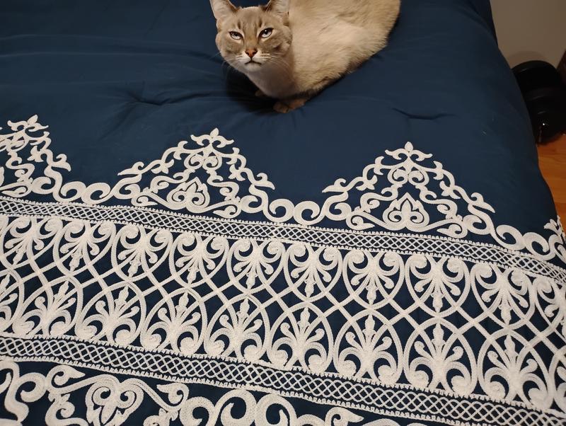 This bedding is very attractive and soft. The shams and two decorative pillows compliment the white embroidery. The look is very sophisticated with the white embroidery starkly contrasting the dark blue. It would go with a variety of home styles as it is very versatile. It could work with bohemian or something more elegant depending on the accessories. My bedroom is more modern and I felt it elevated the look quite a bit. The texture is soft and attracts the hair from my Siamese cat that absolutely loves sleeping on it. This is easily taken care of with a lint roller. I recommend this item!