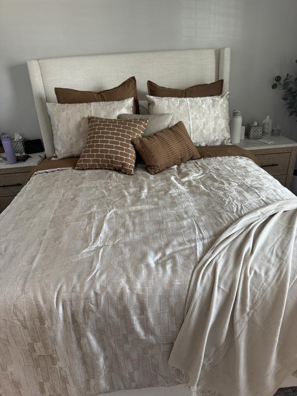 I love the look, shine, and feel of it; however, threads come out easily in just two days it already has threads out. Also the quality of the throw blanket is horrible mine has a whole in it I think from the beginning but not sure. I plan to keep it because it’s pretty and matches although I know it won’t live long