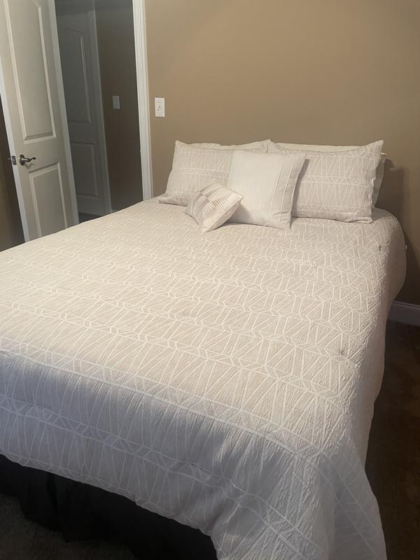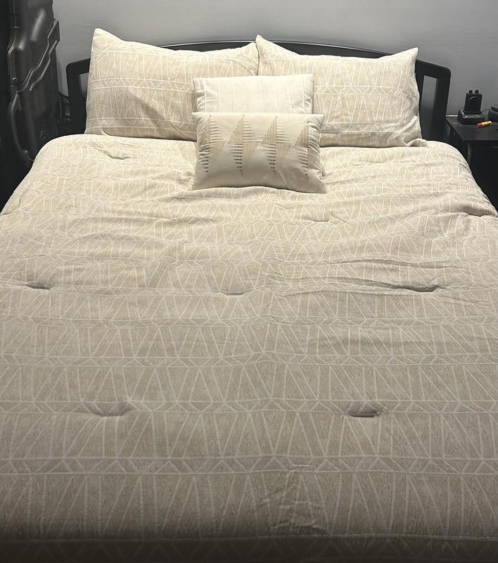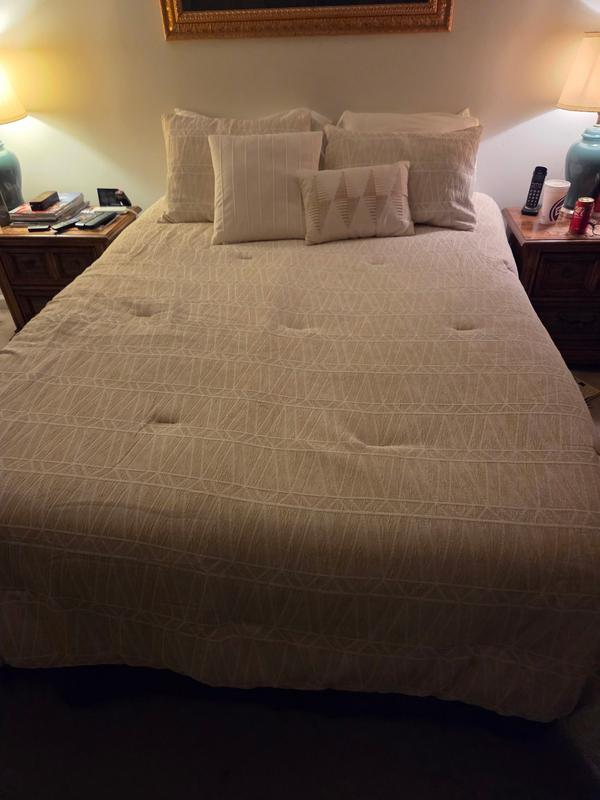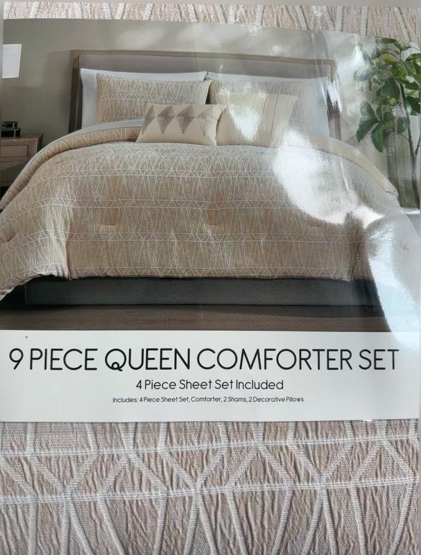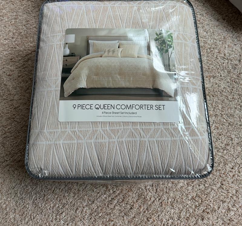 The Wells 9 piece comforter set is an all inclusive bedding set consisting of a comforter, 2 matching shams, a solid 4 piece sheet set and 2 decorative pillows. The geometric pattern and the neutral beige color is perfect for households ranging from classic to modern decor. The comforter is soft yet mid weight, the patterns have a nice embossed feel to it without the bulging out fabric effect. I am not a fan of microfiber sheets in general but these are not as thin as the generalized sets available in the market and will do just fine. The decorative pillows are definitely a nice touch for the bedroom outlook. Overall, it is definitely a great addition for all season long.