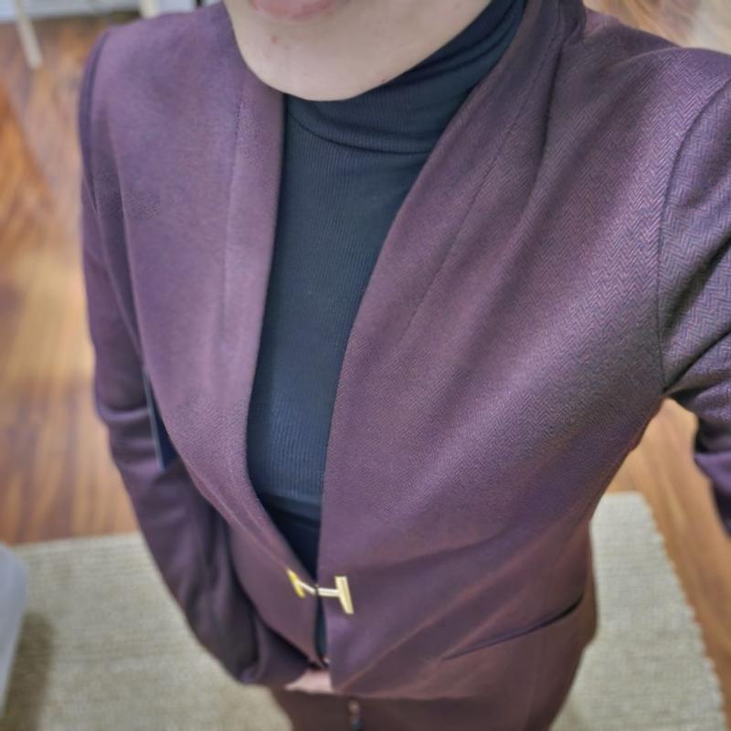 I absolutely love this Halston Women’s Knit Jacket. The material feels high‑quality and holds its shape well, even after machine washing, which is a big plus for easy care. The deep raisin color is rich and versatile, so it works with dressy outfits or a more casual look. Fit is the main thing to note: it runs a bit small. I’d recommend sizing up to get the most flattering fit and comfort, especially if you plan to layer under it. Otherwise, it looks polished and modern, with that elegant hardware detail giving it a refined finish. Overall, it’s cute, durable, and feels like a piece you’d happily wear for seasons. I’d buy from this company again. [I received this product in exchange for my honest review]