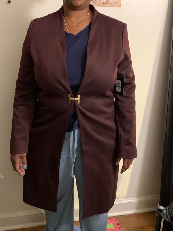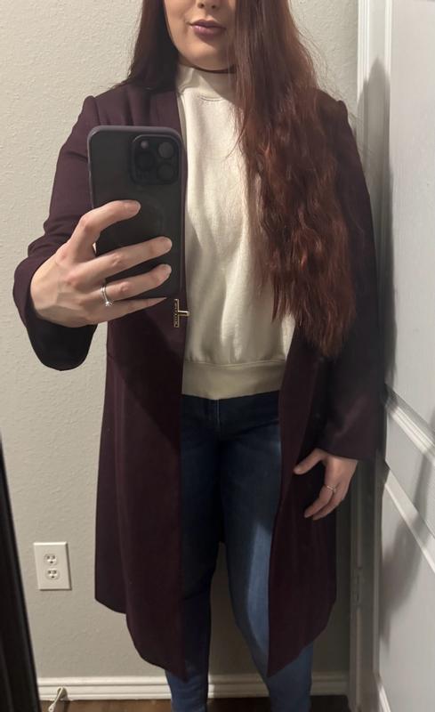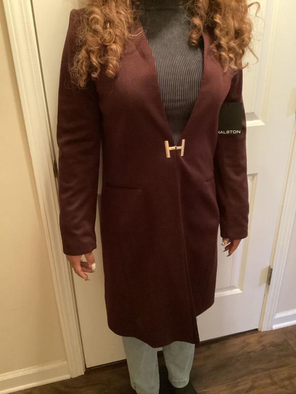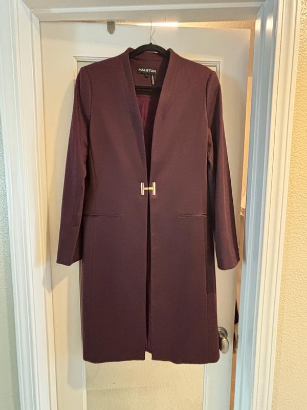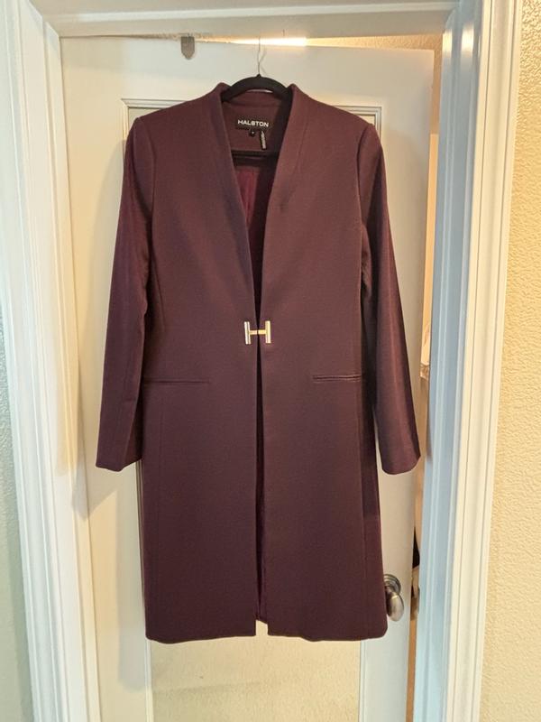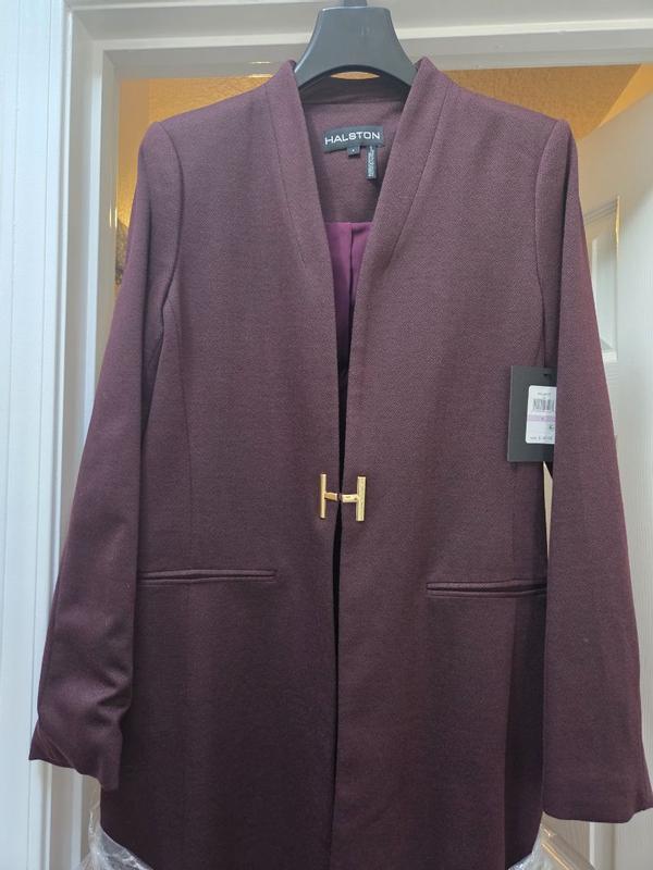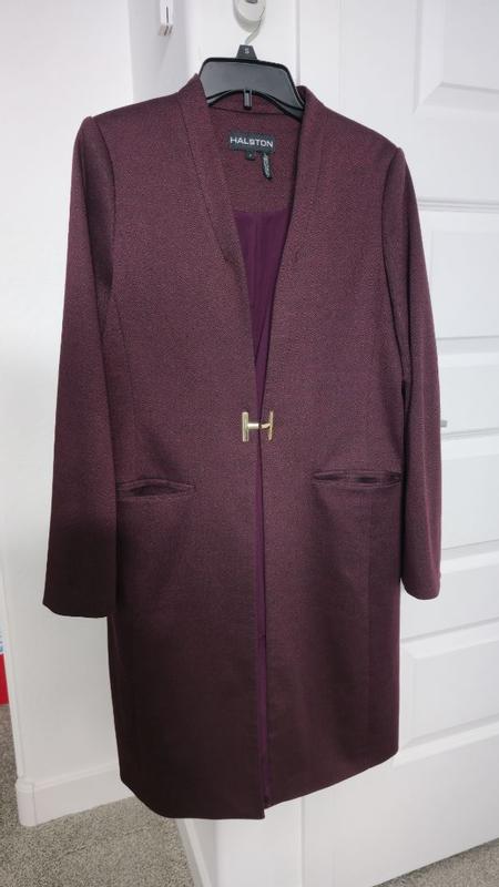 The Halston Knit Jacket in Raisin is even better in person. The material is soft, well-made, has a great fit and weight to it. . On the second photo, it shows a small herringbone pattern. The jacket is a little longer than tea-length and has a fun neckline. The raisin color is a deep eggplant color. It's really versatile. It would be great with jeans and heels or over a dress. This product was provided to me by Influenster for testing and honest review.