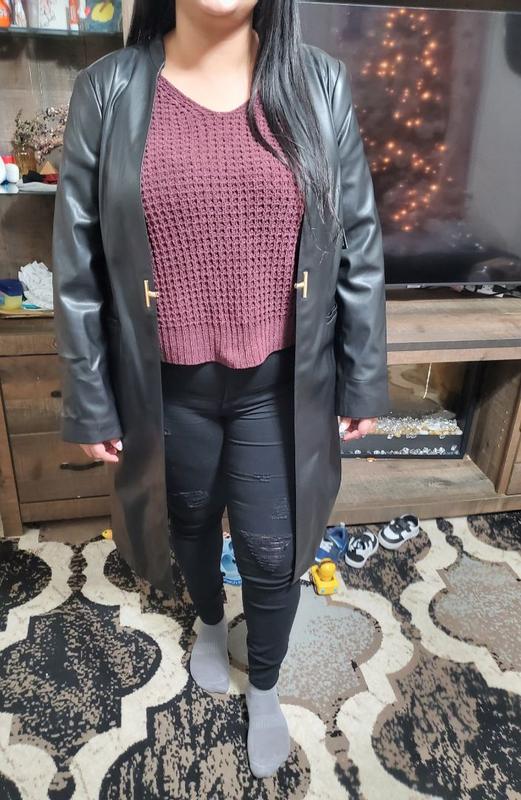 I love the aesthatic. Leather and lightweight coat. It's light so if you live in a cold place it won't work for the winter months. It's so comfortable with a slight stretch to it. It doesn't smell like anything. I'm not sure how the leather will hold on but it looks and feel like good quality . Overall comfortable and stylish