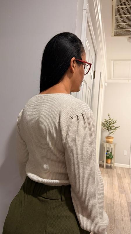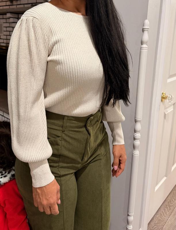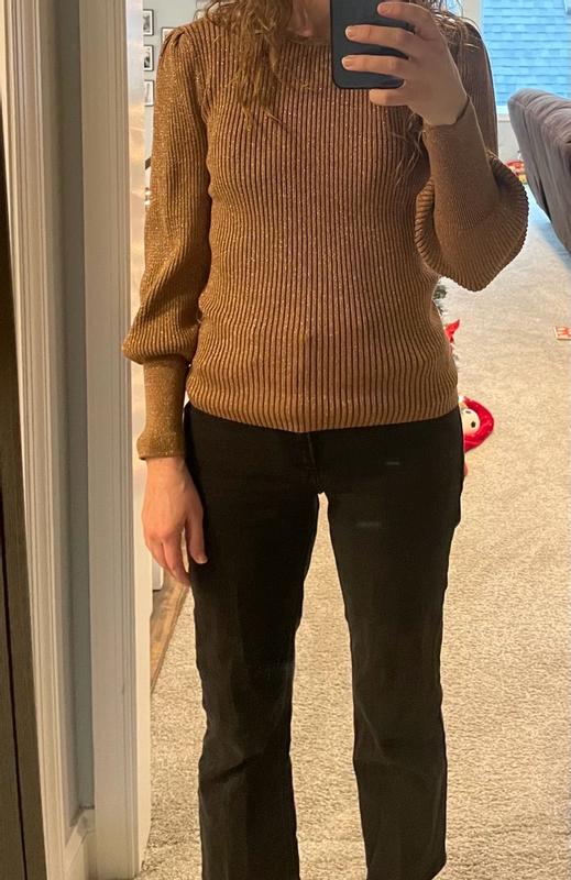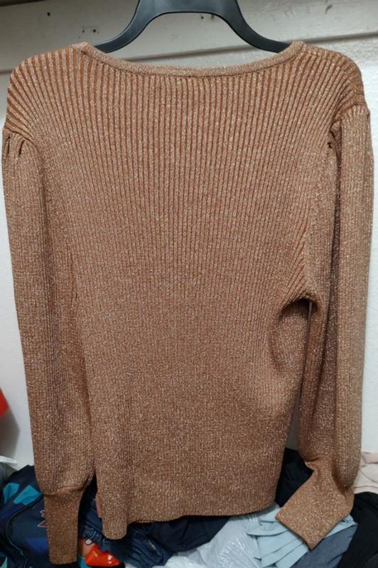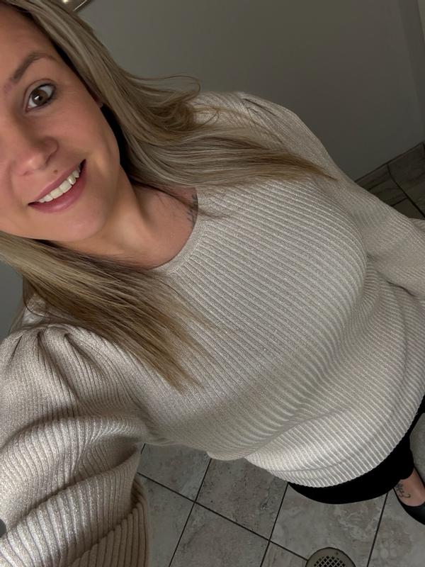 This is a really nice sweater! I like the subtle shimmer which makes it more elegant and a good top for a night out. This fits true to size. It has a great stretch to it. The only negative is the fabric is scratchy. I prefer to wear a tank top under it so it doesn’t bother me as much. This is a very versatile piece which can be worn with almost anything especially with the neutral color. Overall a great addition to my wardrobe.