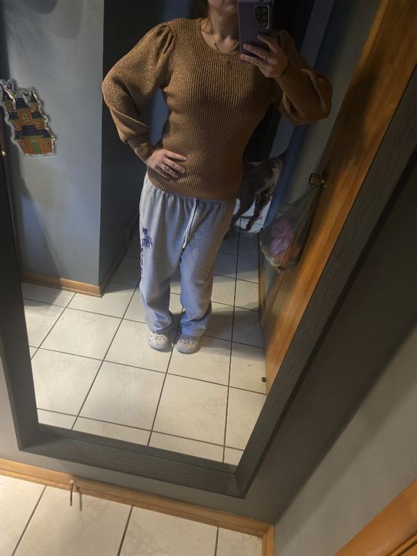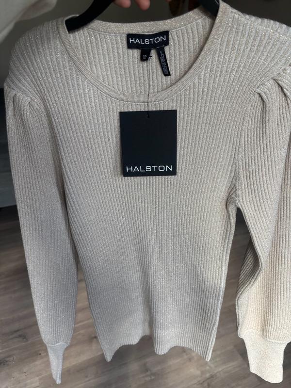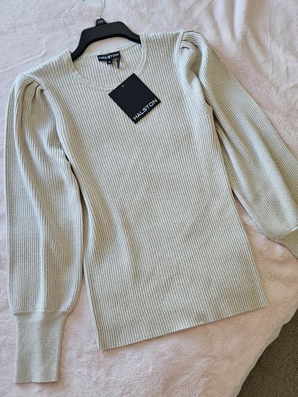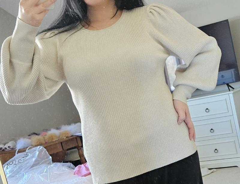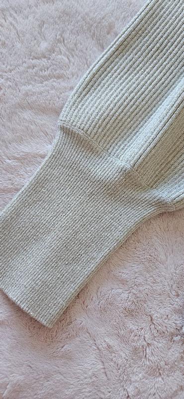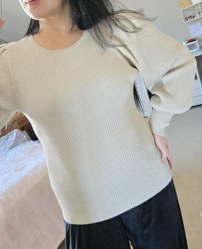 A very beautiful sweater. The style fits nicely on the figure. The voluminous sleeves add to its appeal. The lurex in the fabric makes the sweater look elegant, but it can be a little itchy against the skin. However, it remains comfortable to wear. The fabric does not float, it is breathable. I like the quality of the tailoring, the neat seams.