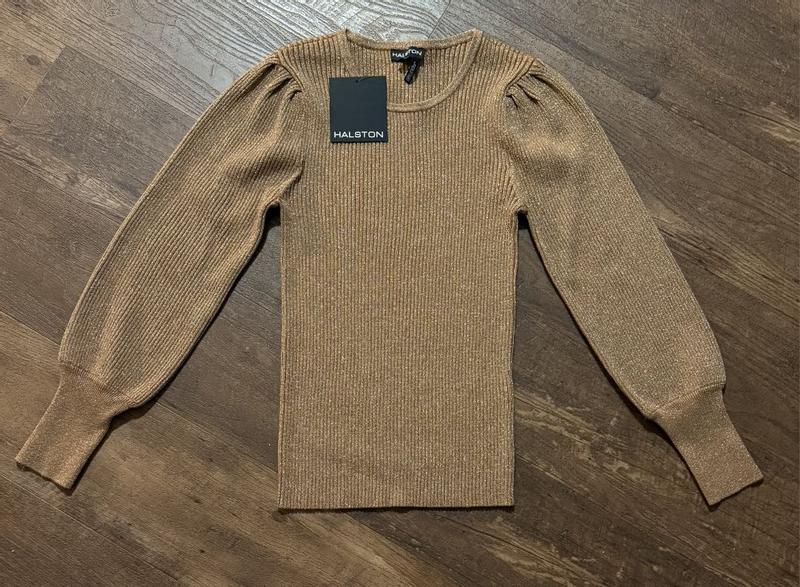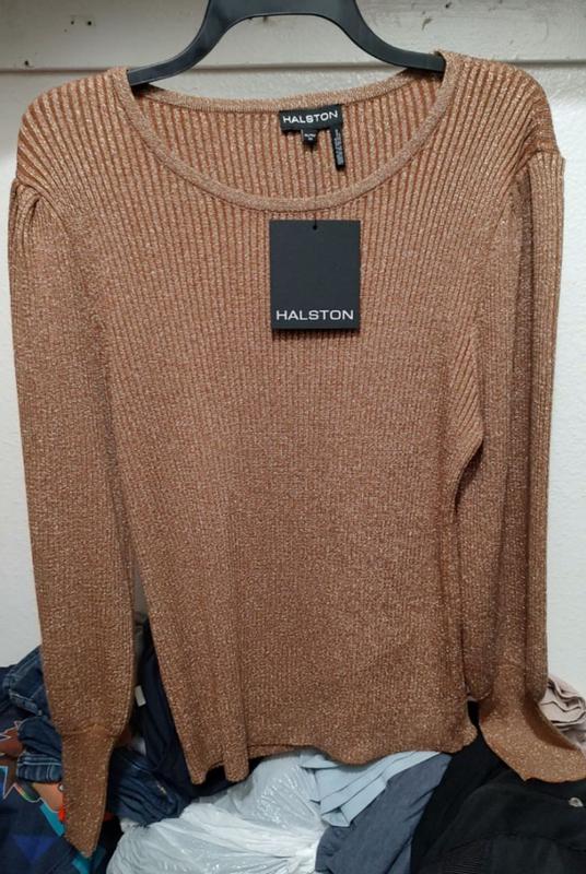 Halston Womens Long Sleeve Sweater.I was very surprised when i received this it looks way better than in the picture posted, is very shiny golden my favorite.Will use it on New Year's Eve love love thank you.