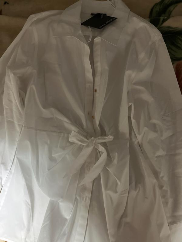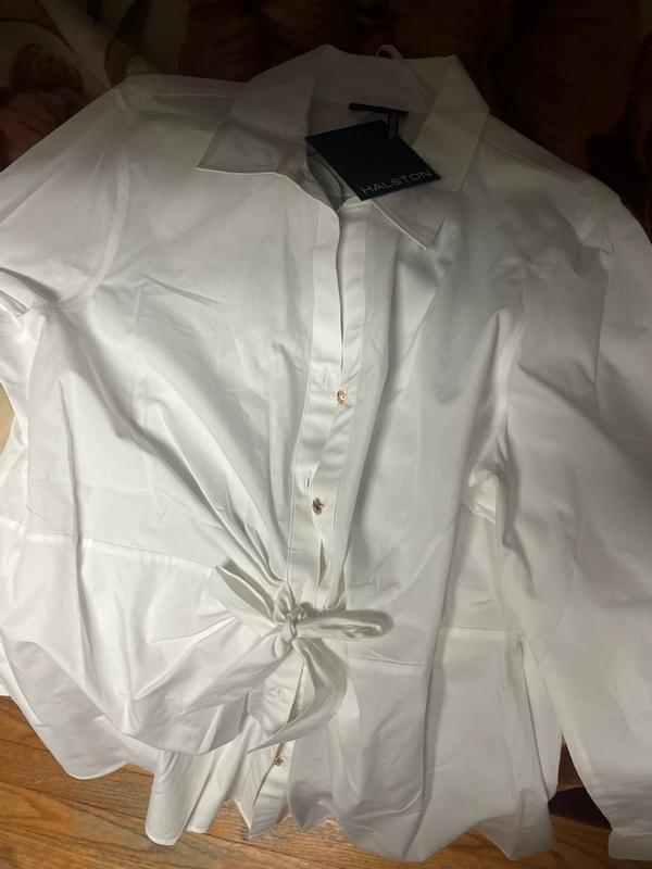 Ensure a polished look with this poplin shirt from Halston, a versatile addition to any wardrobe. Featuring a collared neckline, long sleeves, and a front tie, it offers a flattering fit while elevating your overall style.