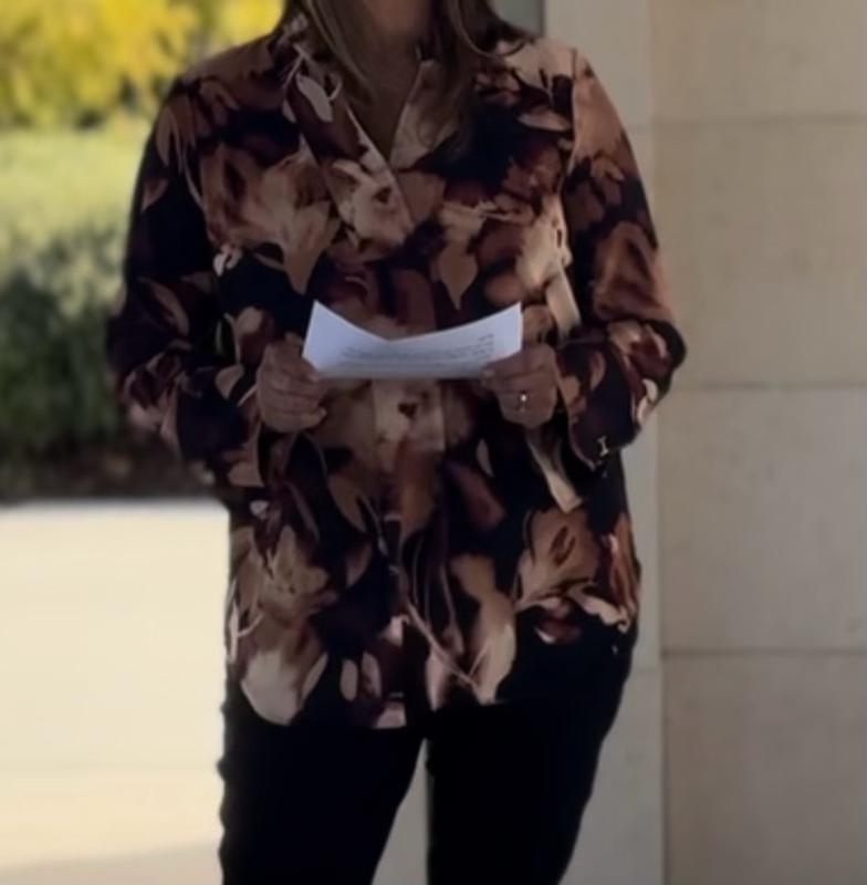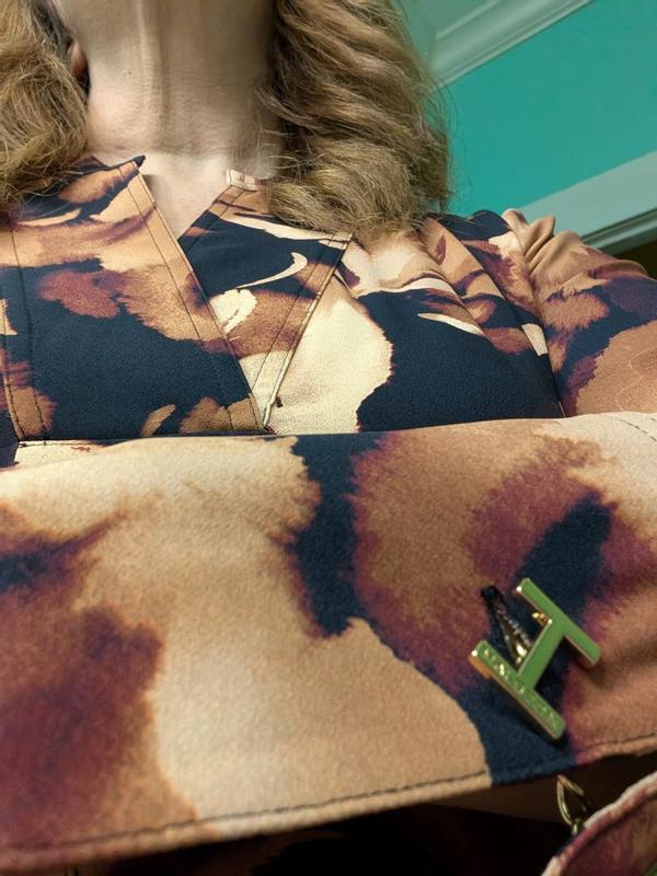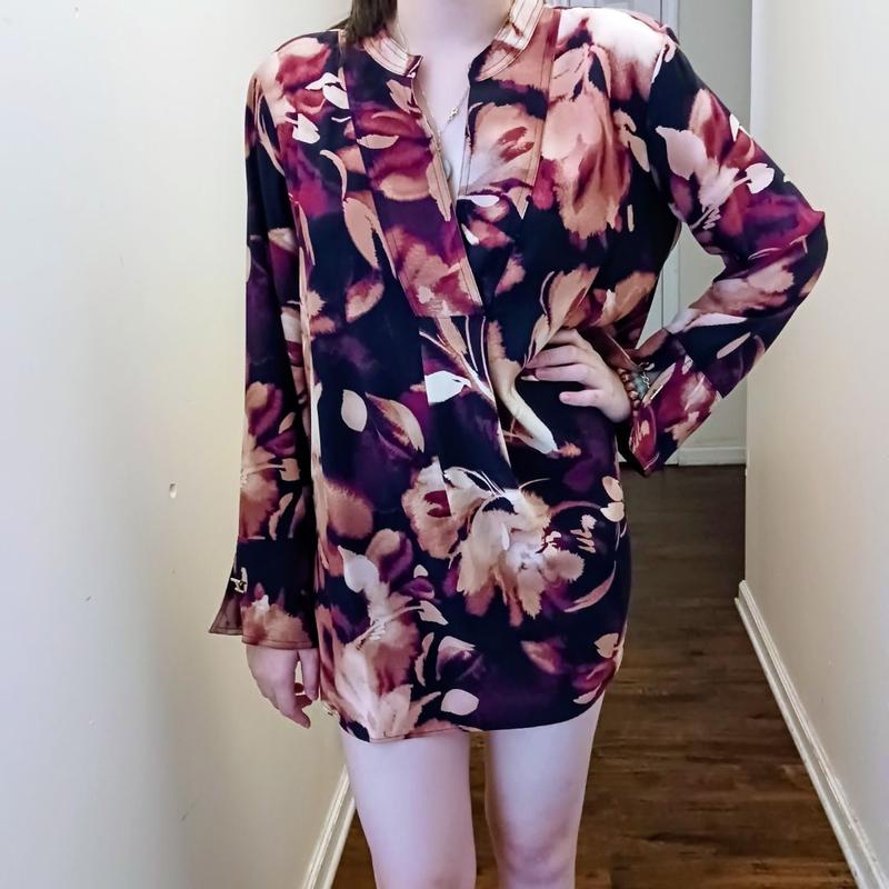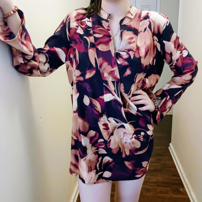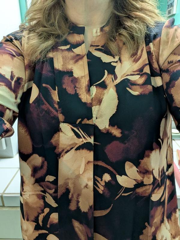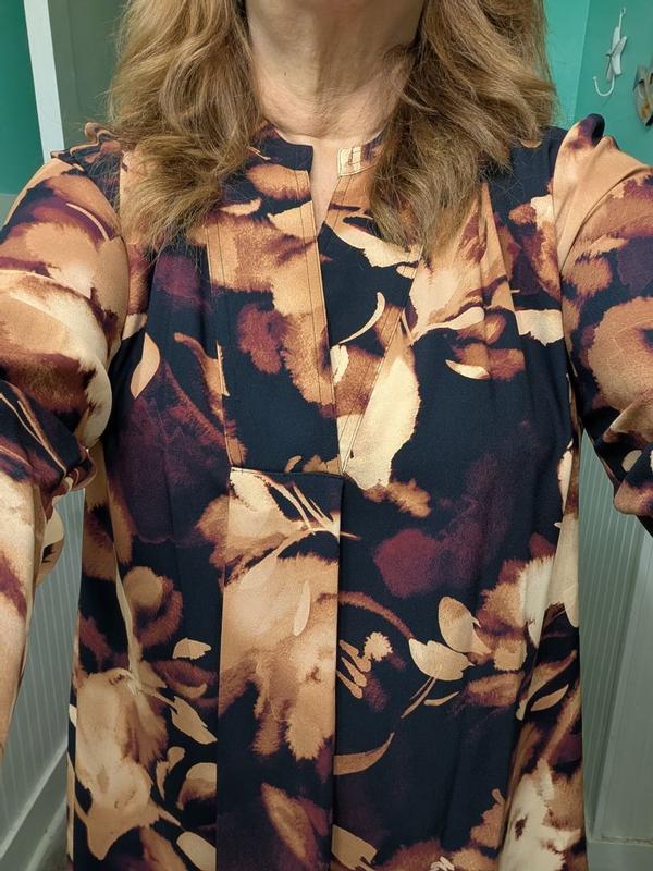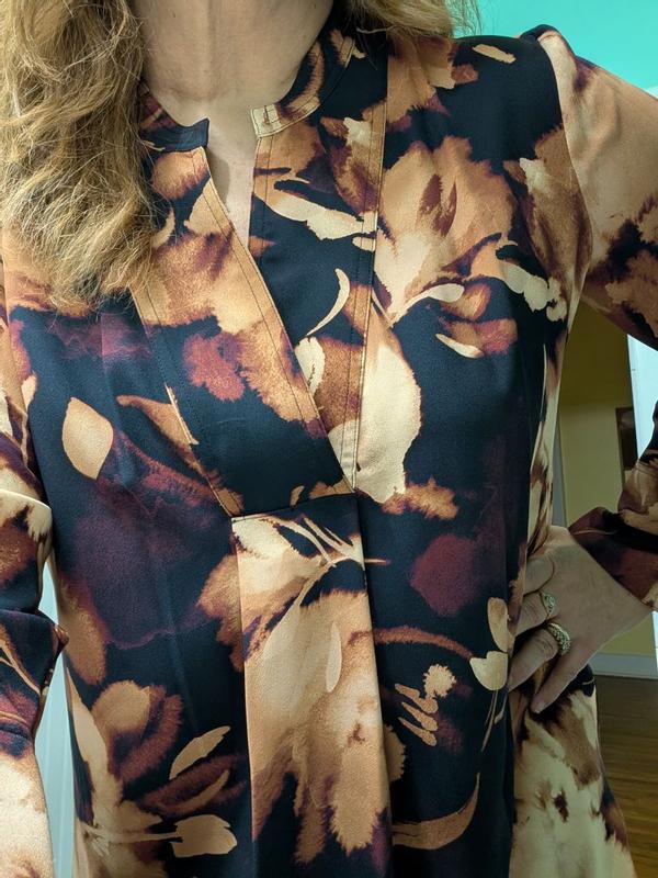 First of all this shirt is very beautiful in nice fall colors, it's very sophisticated, comfortable, true to size. This design is very unique as it has a scoop neck that transforms into a V-neck. It has an elegant accent in the front to help hide your tummy, it has nice belled sleeves with cuff links "H" logo in gold for Halston. It has a flattering cut, it's very slimming. The shirt material is silky feeling with a touch of stress, but not much, it is very thick, but light high quality material. I would highly recommend this tunic shirt to anyone as it can be worn up or down for any occasion.