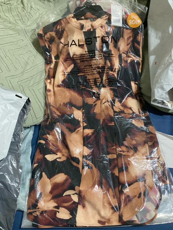 The Halston printed long sleeve tunic is a very comfortable shirt. I wore it to a memorial service this weekend in 70 degree weather and it was perfect. The cuffs are really fun with the gold H and chain and they give the outfit a nice flowy look. The shirt is perfect for over top of a cami-I wore a black one. The 100% polyester is very breathable and is super comfortable with a light stretch. I really loved the way the tunic looked with my black jean leggings.