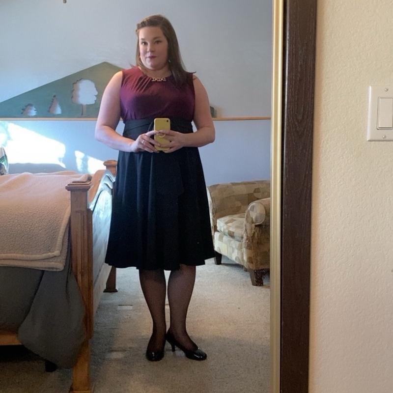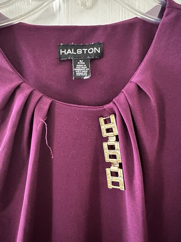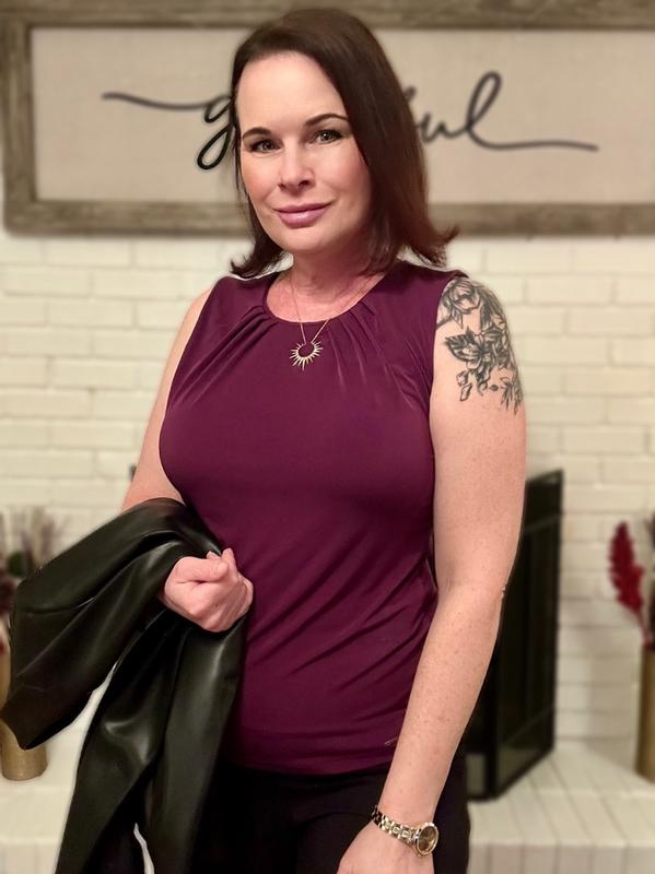 This sleeveless knit top is a nice piece overall. The burgundy color is pretty and the fabric is soft with just the right amount of stretch. The fit is figures-enhancing and drapes nicely over the body without clinging. Bonus, it’s machine washable and essentially ready to wear with no ironing or steaming needed. That said, the gold chain links sewn into the bust, while a nice design detail, ended up being too heavy for the fabric. After wearing the top several times and washing three according to the care instructions, the chain links came loose on one side after the third wash. The interior logo tag also began to come apart. Unfortunately I didn’t take a photo before this happened. Rather than having the links sewn back on, I chose to remove them completely and styled the top with my own necklace. Overall, this is a nice flattering top and would honestly be perfect without the sewn-in jewelry. Knowing what I know now, I’d recommend hand washing and hanging it to dry to preserve the details.