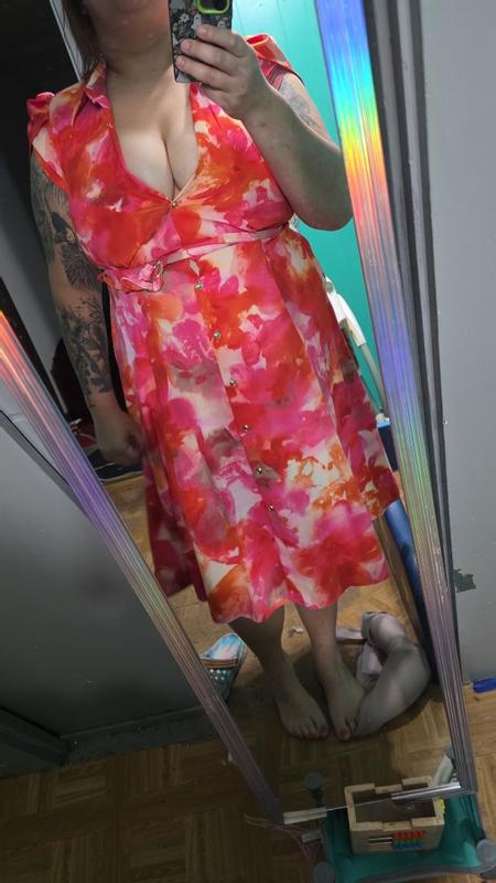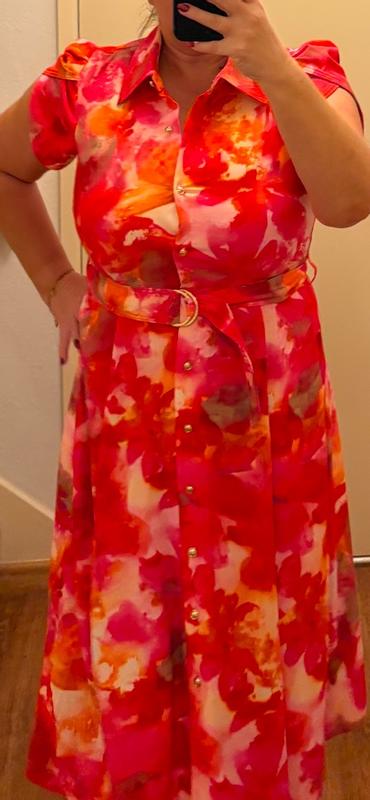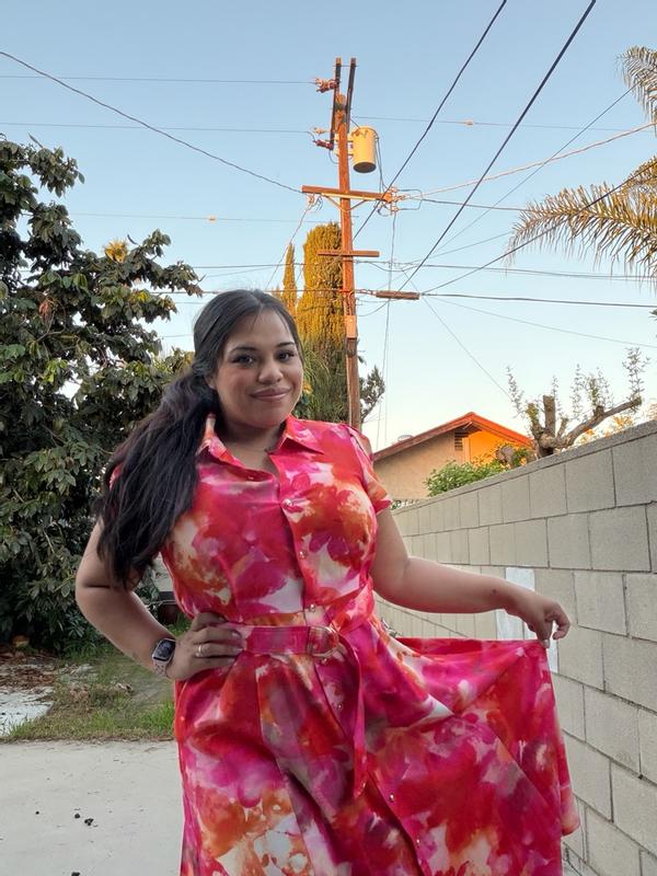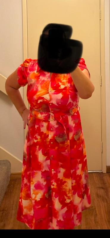 This is a very beautiful and brightly colored dress. It fits very comfortable with an easy to adjust belt. The tulip sleeves are cute and stylish. I am usually worried about button dresses gaping in front but I didn’t seem to have any trouble with this one. This is an any occasion dress and perfect for bright summer days.