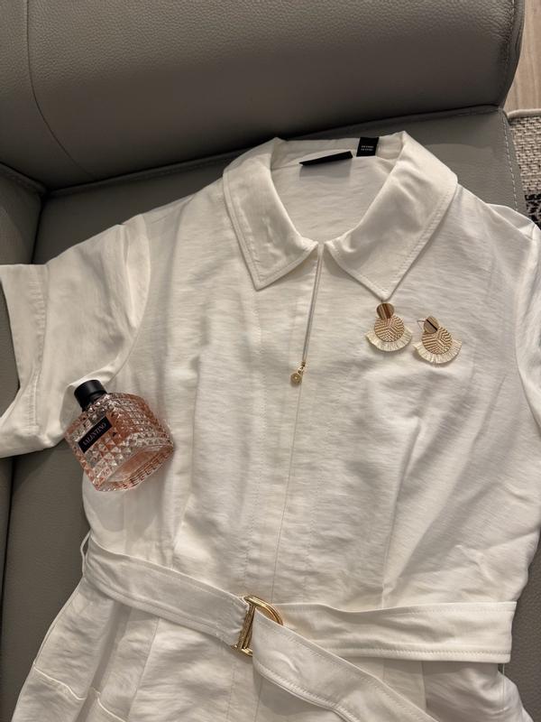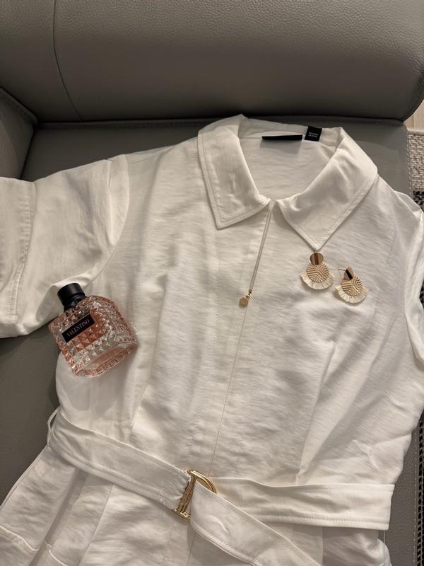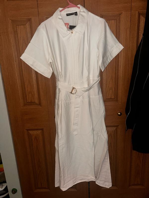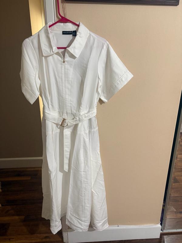 I got the halston women’s maxi belted shirt dress In white. It it a denimy cargo utility type material which I didn’t expect. But it is very sturdy and durable and good quality. Easy to wash. The dress itself is very cute. I definitely didn’t like the sleeves. They were awkward length and are not flattering unless your 6’1 and 70 pounds. I’m very short at 5’1 so the sleeves went out to my elbows and added a lot of weight to my frame. I saw they had the same dress but sleeveless. So I sent it to my trailer to have the sleeves made into sleeveless. Omg it’s so much more elegant and literally the perfect summer dress. I love the gold detailing on the belt. I did have to steam it to get wrinkles out but wow I seriously love this dress. If I were taller I’m sure the sleeves would look good but being so short it just was not a good fit. Just like you would tailor jeans to fit your body I highly recommend spending the extra money if you need it to fit you. Such a perfect airy summer dress. You can dress it up or down with just a few accessories. Great elegant quality for a great price.