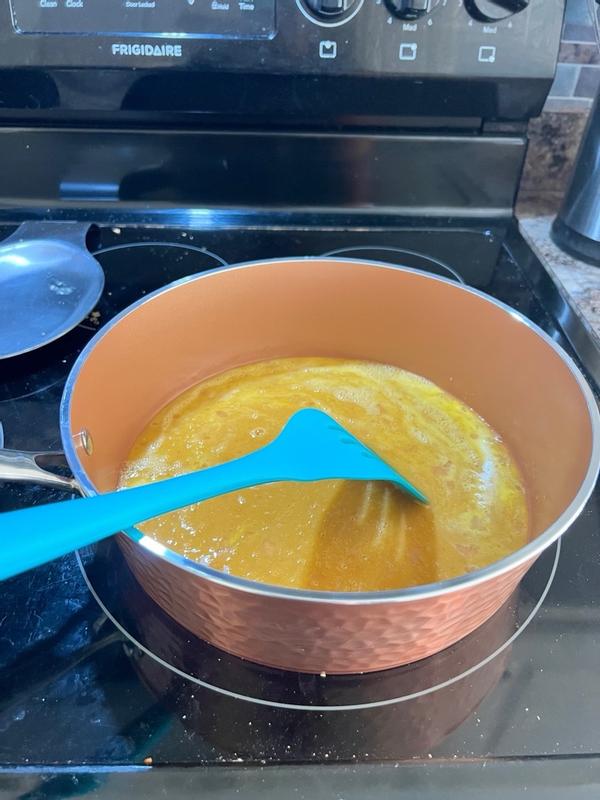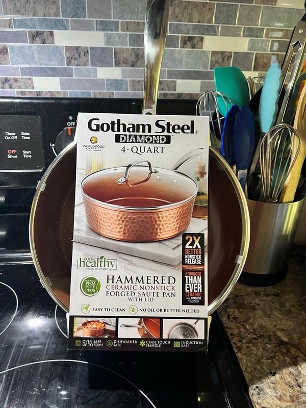 First impression of Gotham Steel Hammered Copper 4 qt. Aluminum non-stick deep frying pan is a design, how beautiful, unusual it looks on the outside, like the edges of a precious stone. Cooking was a pleasure the first time I fried meatballs, I usually use parchment for this to make it easier to wash the pan and they turned out great, better than on my other non-stick frying pan. I also stewed scallops in butter and everything went great, no burning or sticking. I also stewed meat and everything works great. I have not had Gotham Steel cookware before, now I will definitely have more of the cookware. Well, the quality is very cool and it durable and what a design. You will not be disappointed!