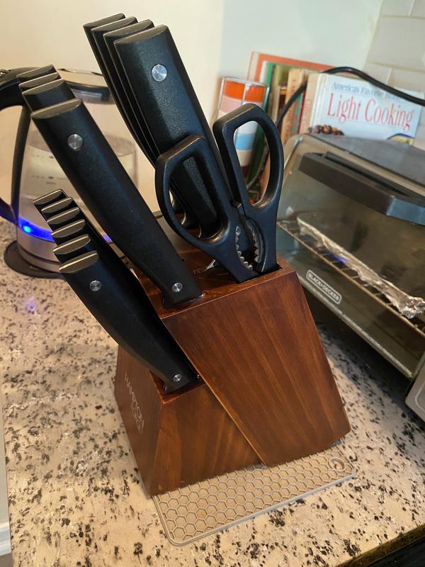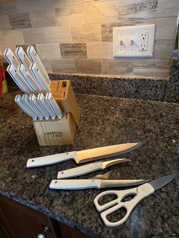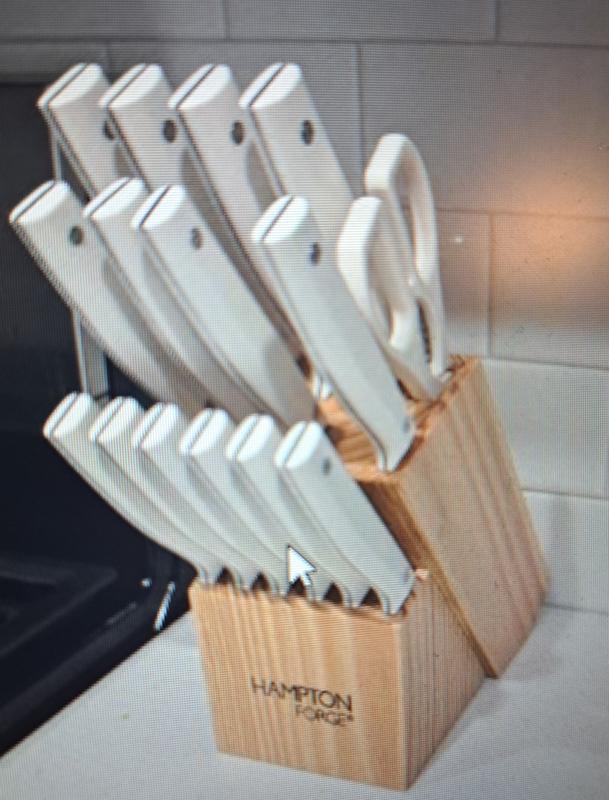 The set is very nice and quite complete, but unfortunately, the wood base is poorly crafted—I even got a splinter from it. Additionally, the color is not pure white as expected; it’s more of a linen or creamy white shade. This was disappointing since I had carefully chosen kitchen items to match, and this set didn’t coordinate as I had hoped. Unfortunately, I have to keep it because my husband unpacked it and discarded the box before I got home. Despite these issues, it is still a lovely and functional set overall.