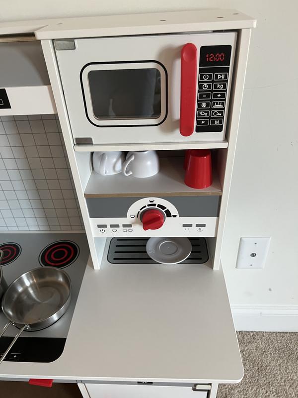 This Kitchen made by Hape is one of the cutest realistic kitchens I have seen so far. It is a very easy kitchen to put together and iit is very durable and made out of quality wood. It does include a few extra accessories to get your little one on their way cooking and serving up food. The Microwave opens and closes and makes a cute little ding noise. Above the stove is a little light that really works. All the doors open and close easily. There is plenty of room for storage for additional food and pots and pans. This is a great kitchen to teach your little ones how to organize and show knowledge of working and cooking in a kitchen and helps to spark their creativity while role playing. This is a good size kitchen and is big enough for two kids to be able to play at the same time for hours.