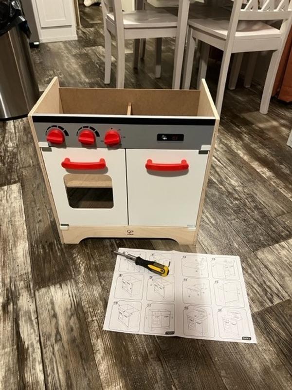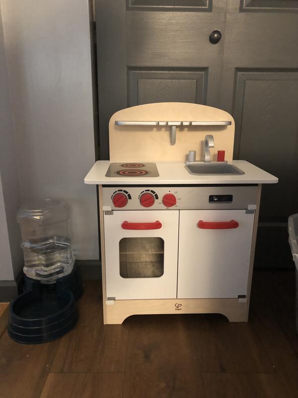 I received to he Hape Pretend White Kitchen from the Try It Community. It didn't take long to put together. It's light enough to move around in the room. My granddaughter spent hours pretend baking in her oven, cooking on the stove, prepping meals, and then cleaning up in the sink. Now when we make meals in our kitchen, she makes pretend meals in hers