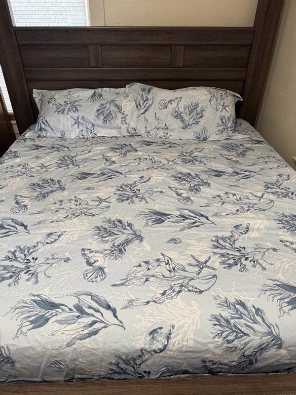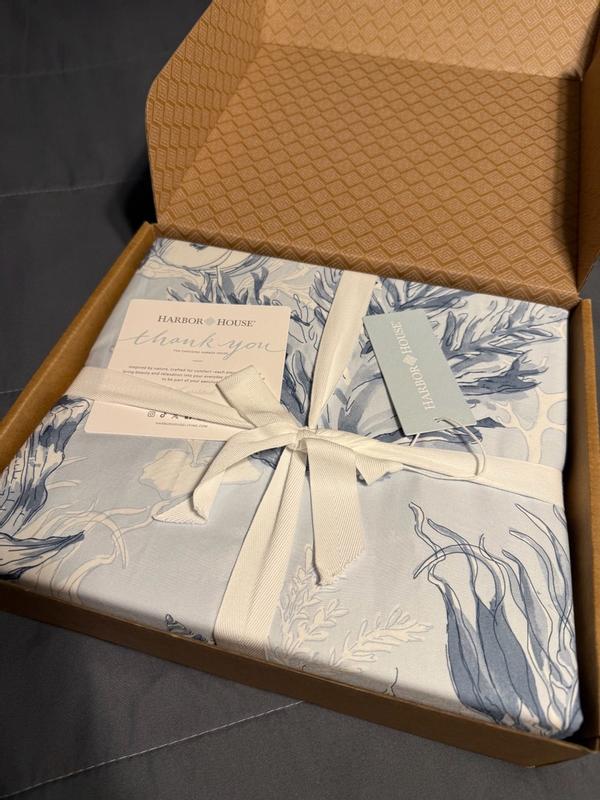 This Harbor House duvet cover set is beautiful and amazing quality! It is a 100% cotton sateen duvet cover and two pillow shams set. It is very high quality, sturdy, heavyweight, and fits my queen size mattress perfectly! The colors and designs are beautiful and it really brightens up my room. I love that I can use it as a duvet cover or just use it on its own during the hot summer months, because it is heavier than a sheet but not as warm as a comforter. On the end of the duvet cover it opens up to put the duvet inside and has multiple buttons sewn on the inside to keep it closed. It is machine washable and holds up well in the dryer on low heat! I love this product and absolutely recommend it!