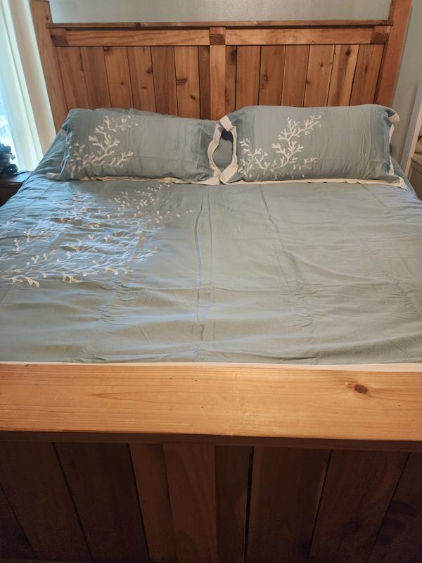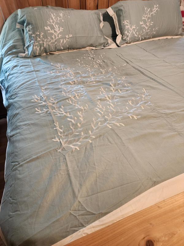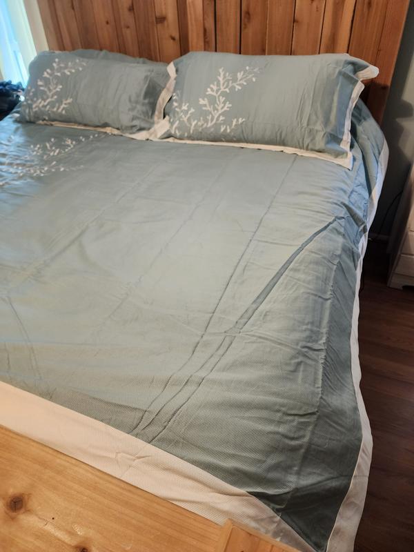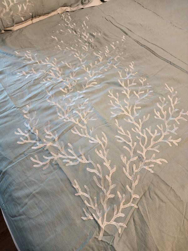 We decided to use this for our bedroom in our summer cottage. Love the gorgeous seafoam/aqua color. Quality workmanship on all pieces. Perfect for summer. I also like the added coral embroidery design which is a nice added touch and also the beautiful buttons which look like seashells. Comes with two pillow shams which fit my pillows perfectly. Overall, a very nice set for summer. Recommended.